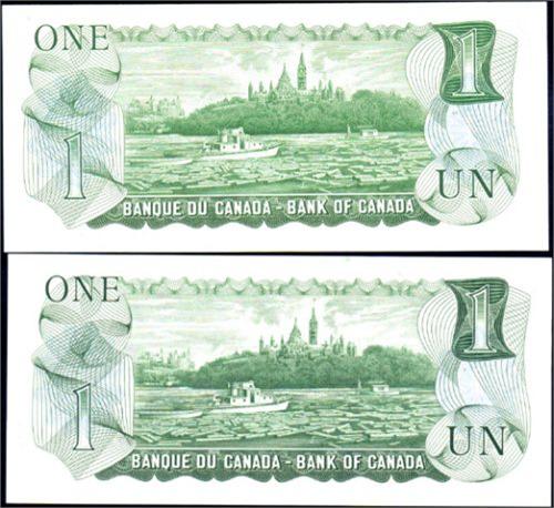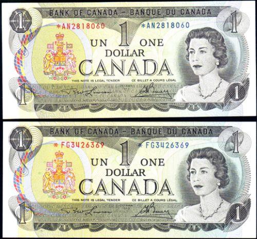 Bank of Canada One Dollar 1973, Lawson-Bouey, BC-46aA Serial Numbers *AN2818060, Unc and *FG3426369, AU-Unc. Total of two notes