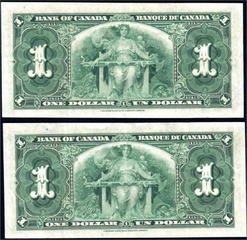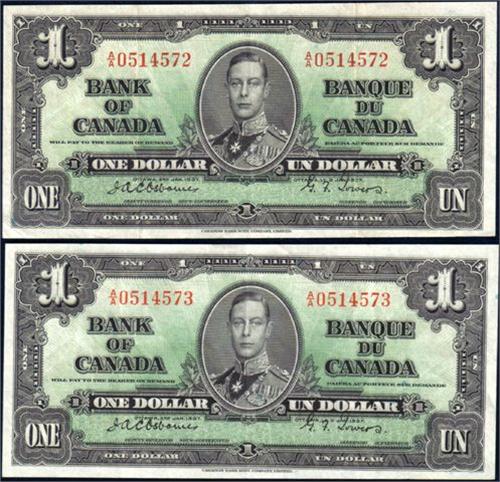 Bank of Canada 1937 One Dollar Osborne-Towers, BC-21a. Two consecutive Serial Numbers A/A0514572 and 573, both bright, clean and original EF