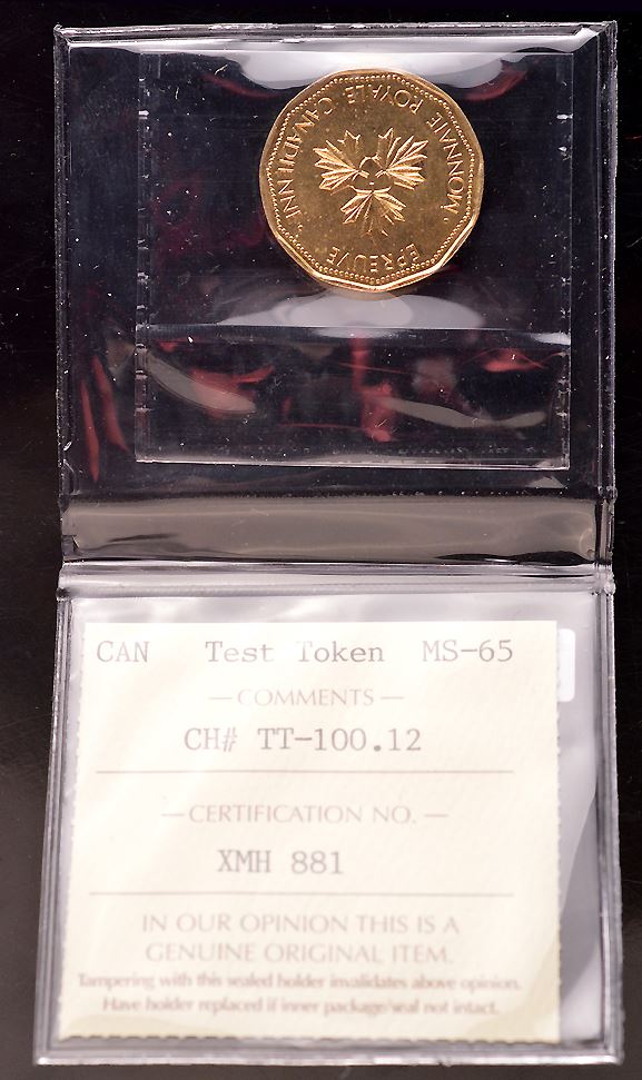 One Dollar, Test Token, (1984), CH#TT-10.21, graded by ICCS Mintstate-65. Mis-attributed as TT-100.12, by ICCS.