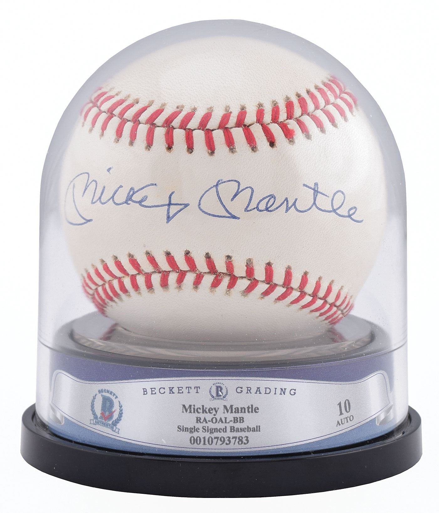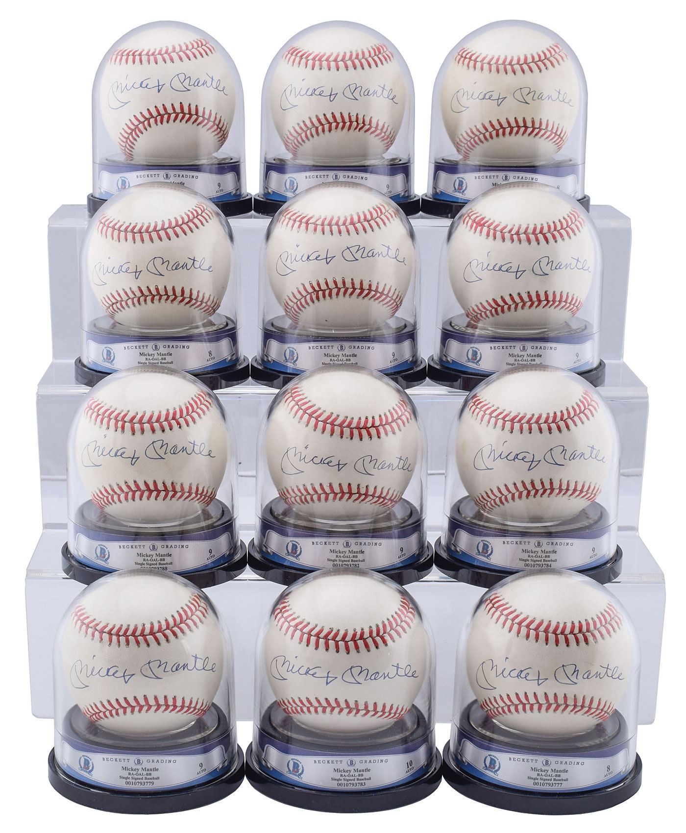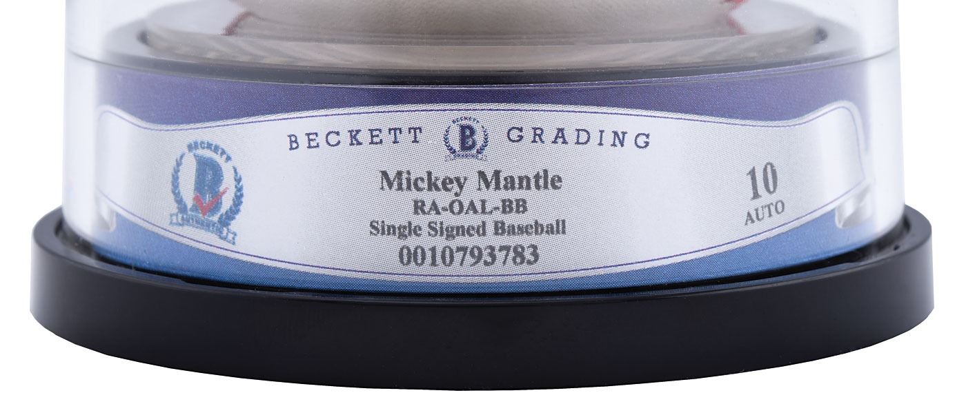 Beckett has authenticated and encapsulated each baseball, and assigned grades based upon signature strength, ball quality, and overall eye appeal. These grades includes: BAS GEM MINT 10 - One baseball. BAS MINT 9 - EIGHT baseballs. BAS NM-MT 8 - THREE baseballs.