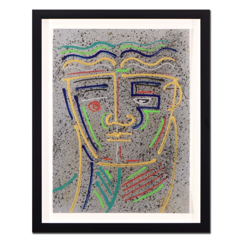 "One Eyed Jack" is an original mixed media acrylic painting on deckle-edged paper by Gaylord Soli, hand signed by the artist. This piece is custom framed. Includes Certificate of Authenticity. Measures approx. 28.5" x 36" (with frame); 22" x 30" (image).