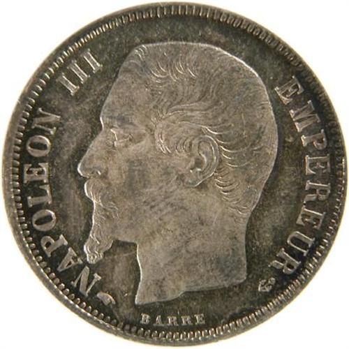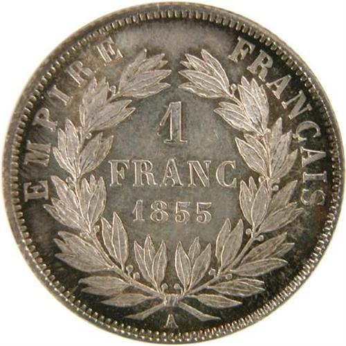 One Franc 1855A NGC MS-65. A fully struck piece with great lustre, attractively toned in light golden mauves with iridescent blues and greens