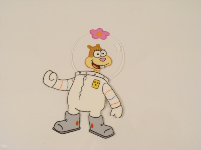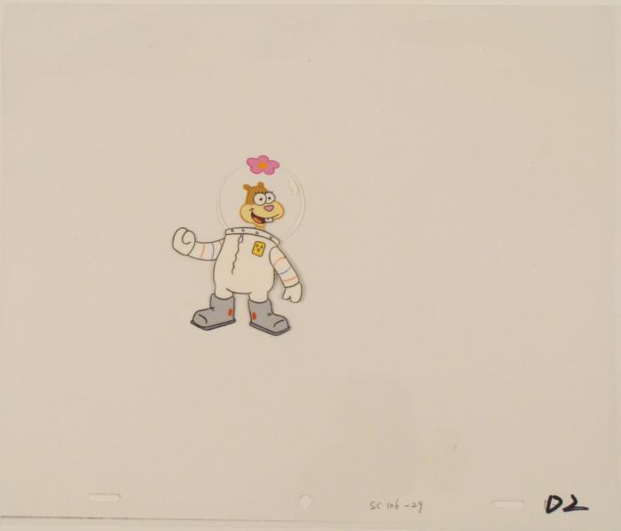 This original animation cel is from the Nickelodeon TV show SpongeBob Squarepants. The story takes place under the deep blue sea in Bikini Bottom, where SpongeBob resides. SpongeBob, who is a yellow, porous sponge, is your typical happy-go-lucky character, as he is always cheerful and enjoys making people laugh. Patrick Star, SpongeBob's neighbor who is a starfish, is your average children's show idiot, as he boasts knowing nothing and is often getting himself into ridiculous situations. Between the homes of these two lies the home of the miserable Squidward, a squid, who is known for being grouchy and playing tricks on SpongeBob and Patrick. Both SpongeBob and Squidward work at the Krusty Krab, a fast food business run by the greedy money-loving Mr. Krabs, a crab, the arch rival of the evil, possibly misunderstood, Plankton. Another neighbor, Sandy Cheeks, an athletic squirrel who normally wears an astronaut's space suit, was introduced in "Tea at the Treedome." She spends most of her time inventing and experimenting. Sandy has one front tooth.Original Production Animated Cel Overall Size of Cel: 10 1/2" x 12 1/2" Very Good ConditionThis is an original hand-painted cel set-up used in the production of an episode of "SpongeBob SquarePants." Each one-of-a-kind set-up represents a slight change in position of the characters. When individually photographed and projected in rapid succession, the images appear to move.