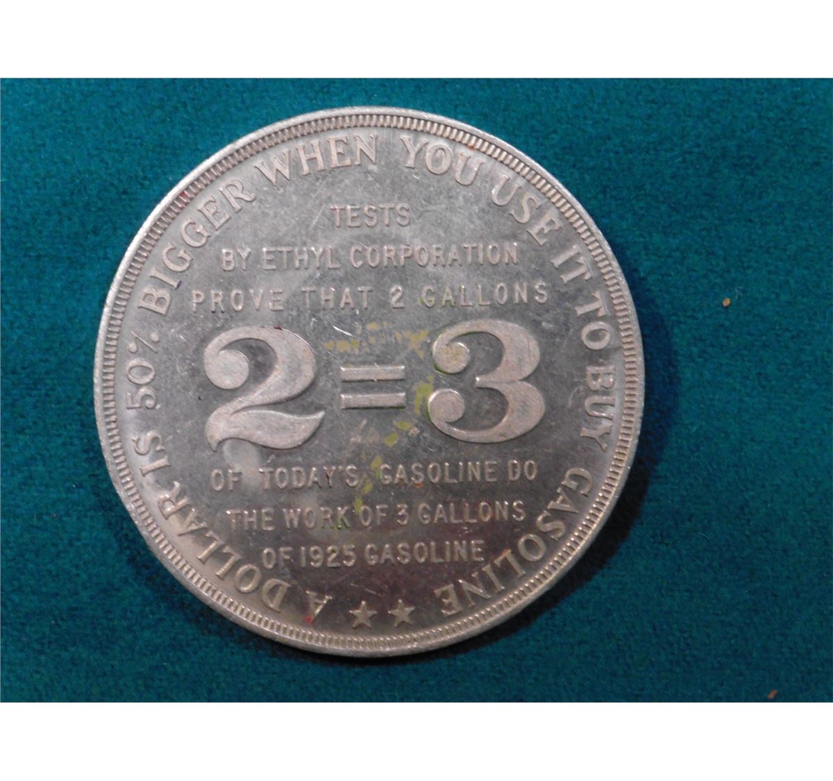 “One Gasoline Dollar”, reverse “A Dollar is 50% Bigger When You Use it to Buy Gasoline/Tests/By Ethyl Corporation/Prove That 2 Gallons/2=3/of Today's Gasoline Do/The Work of 3 Gallons/of 1925 Gasoline”. Large aluminum medal. 50Mm, AU.