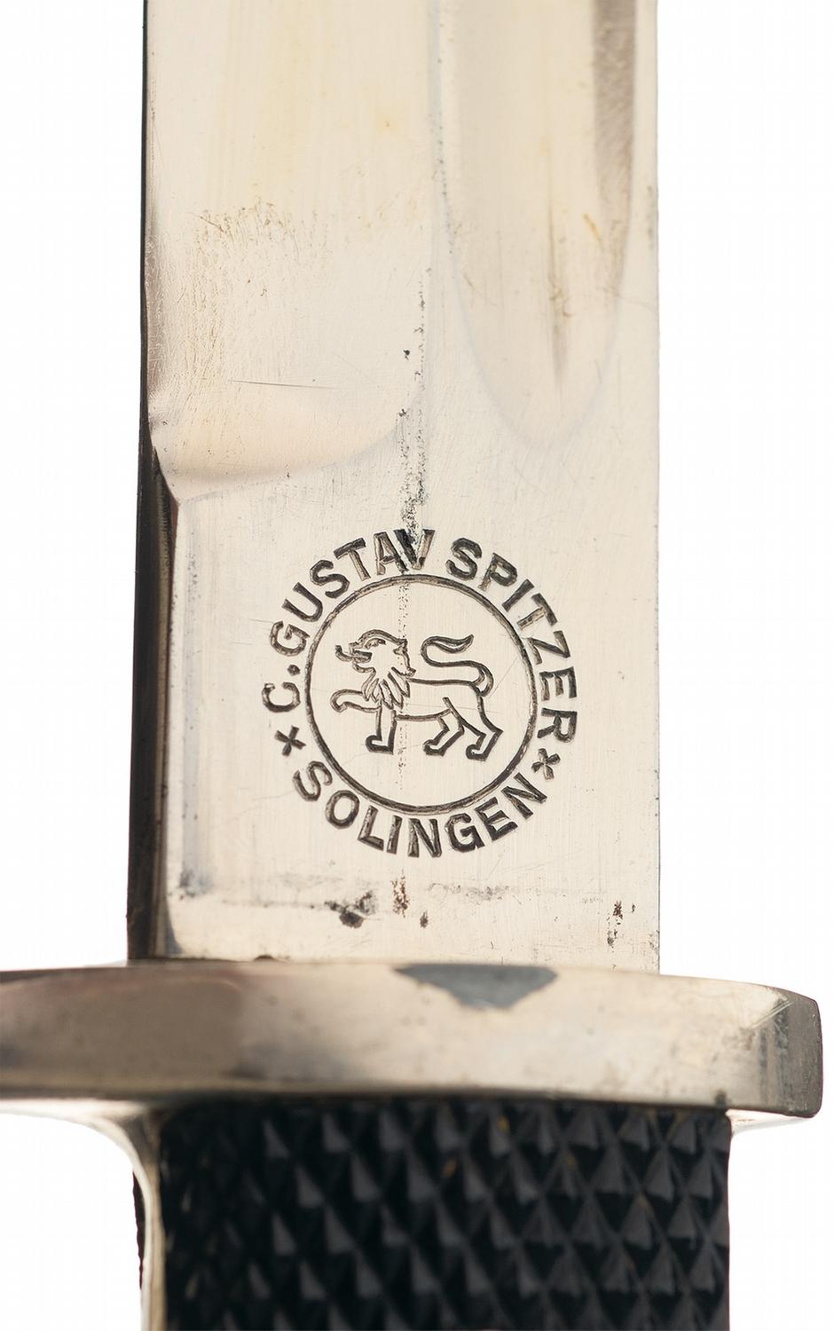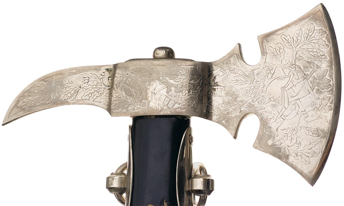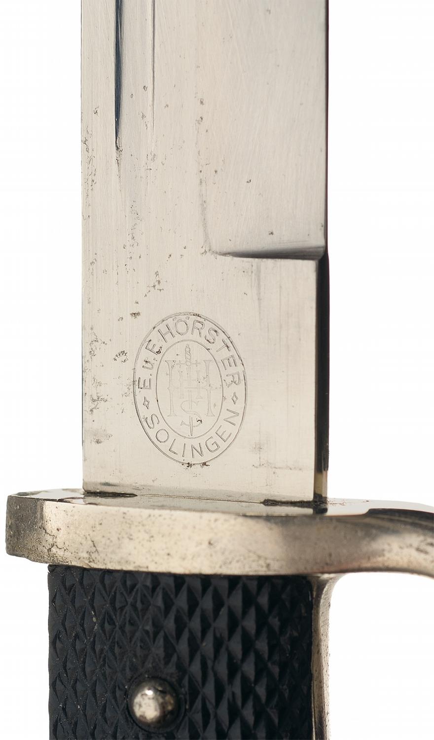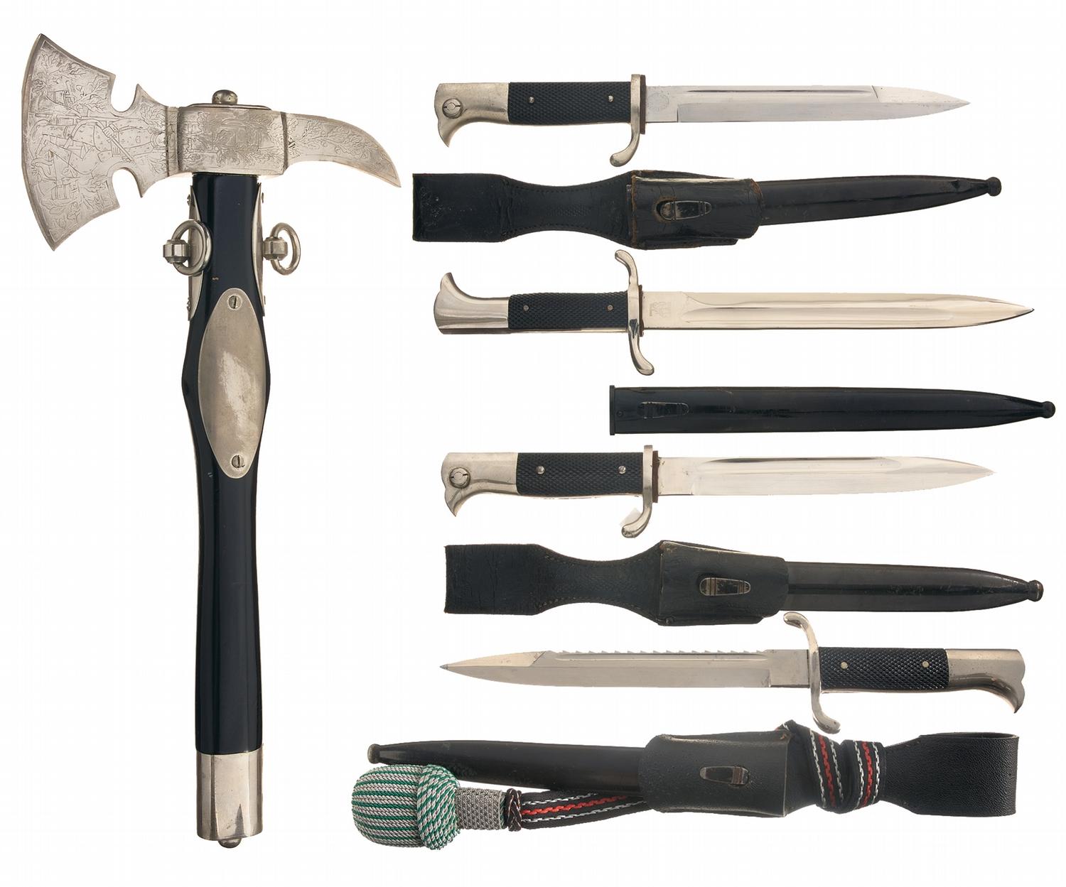 1) Fireman's axe, 6 3/4" long and 3 5/8" tall acid etched head with bill hook on the rear, black painted shaft, 11 3/4" long and 1 1/5" thick, with hanging rings, inscription plate and nickel cap. 2) Horster with dagger "H" logo with rare rubber frog and portapee, saw back Horster (Solingen) bayonet, 7 5/8" single fuller blade, single quillion guard, eagle pommel and metal sheath with leather frog. 3) Eickhorn (Solingen) knife, 9 5/8" single fuller blade, Albert Ziegler (Giengen) merchant mark, dual quillion guard, checkered grips, eagle pommel and metal sheath. 4) C. Gustav Spitzer (Solingen) bayonet, as 2, with 7 3/4" blade. 5) Engineer's knife, 7 7/8" sawback blade with "HHS" monogram, dual quillion guard, metal sheath and leather frog.