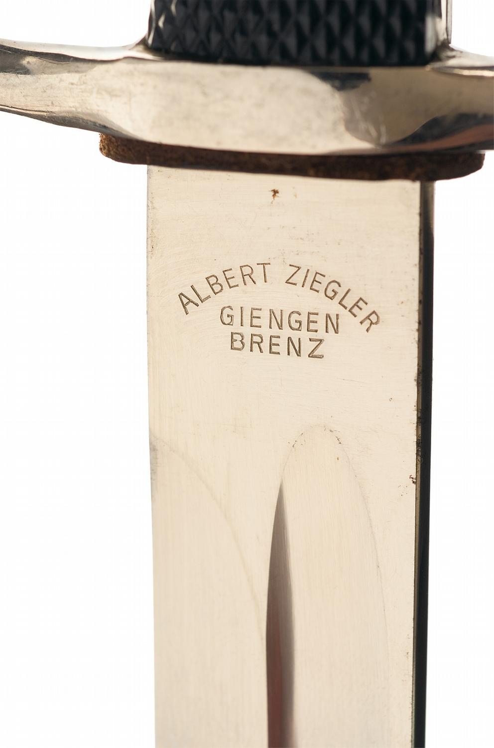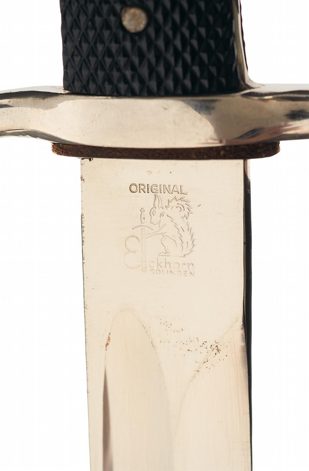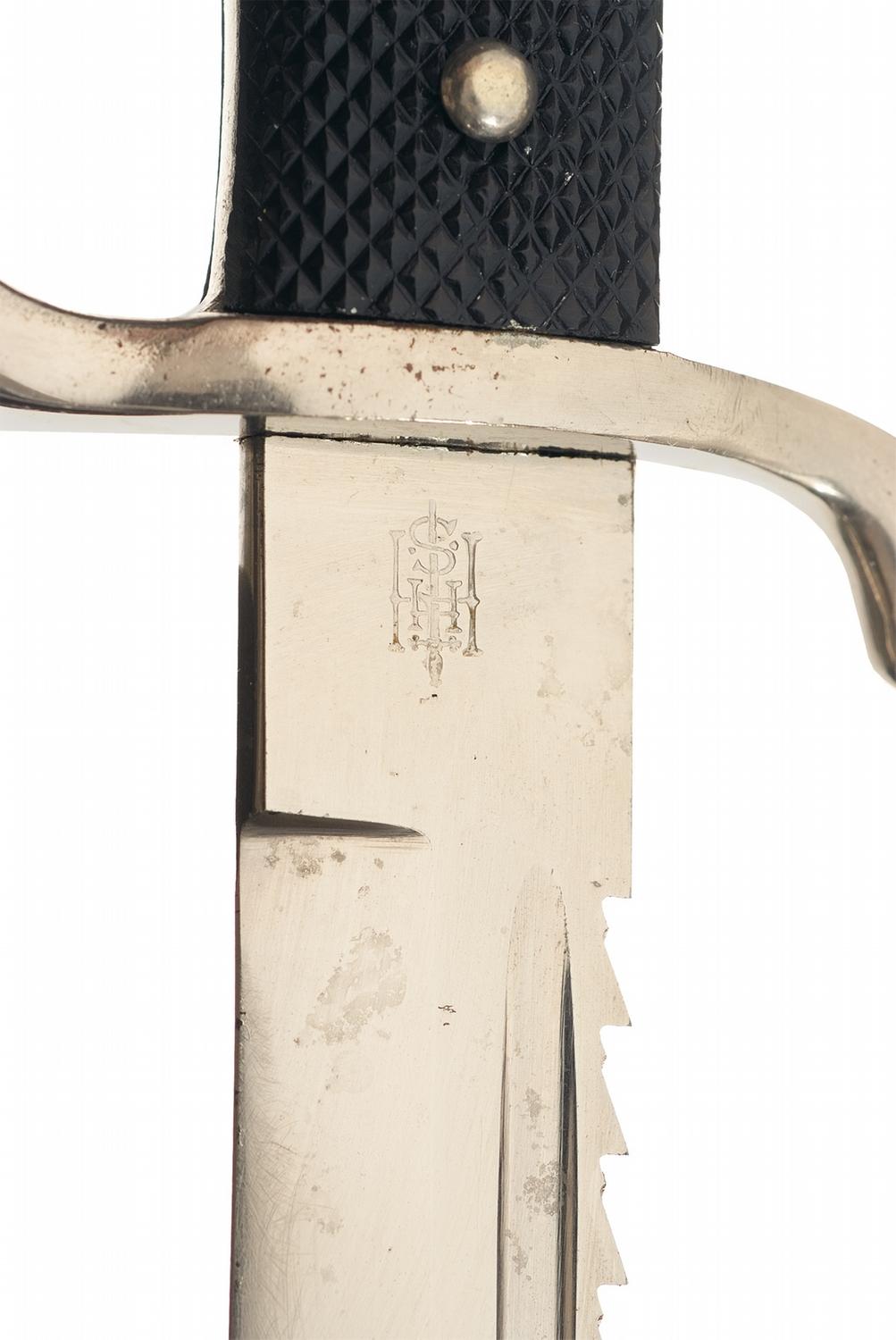 1) Fireman's axe, 6 3/4" long and 3 5/8" tall acid etched head with bill hook on the rear, black painted shaft, 11 3/4" long and 1 1/5" thick, with hanging rings, inscription plate and nickel cap. 2) Horster with dagger "H" logo with rare rubber frog and portapee, saw back Horster (Solingen) bayonet, 7 5/8" single fuller blade, single quillion guard, eagle pommel and metal sheath with leather frog. 3) Eickhorn (Solingen) knife, 9 5/8" single fuller blade, Albert Ziegler (Giengen) merchant mark, dual quillion guard, checkered grips, eagle pommel and metal sheath. 4) C. Gustav Spitzer (Solingen) bayonet, as 2, with 7 3/4" blade. 5) Engineer's knife, 7 7/8" sawback blade with "HHS" monogram, dual quillion guard, metal sheath and leather frog.