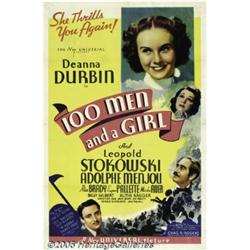 <B>One Hundred Men and a Girl (Universal, 1937)</B></I> One Sheet (27" X 41"). Teenaged singing sensation Deanna Durbin starred in this film that literally saved Universal Studios from receivership in 1937. The studio was in financial crisis do to severe losses, when it decided to gamble on Durbin. This was the first film that cast Durbin as an ordinary kid with an extraordinary voice, a strategy that repeatedly reaped dividends for Universal, putting the studio back on solid ground. There is several pinholes around the borders and corners, smudge marks, slight separation at the crossfolds, and light border stains. Fine/Very Fine.