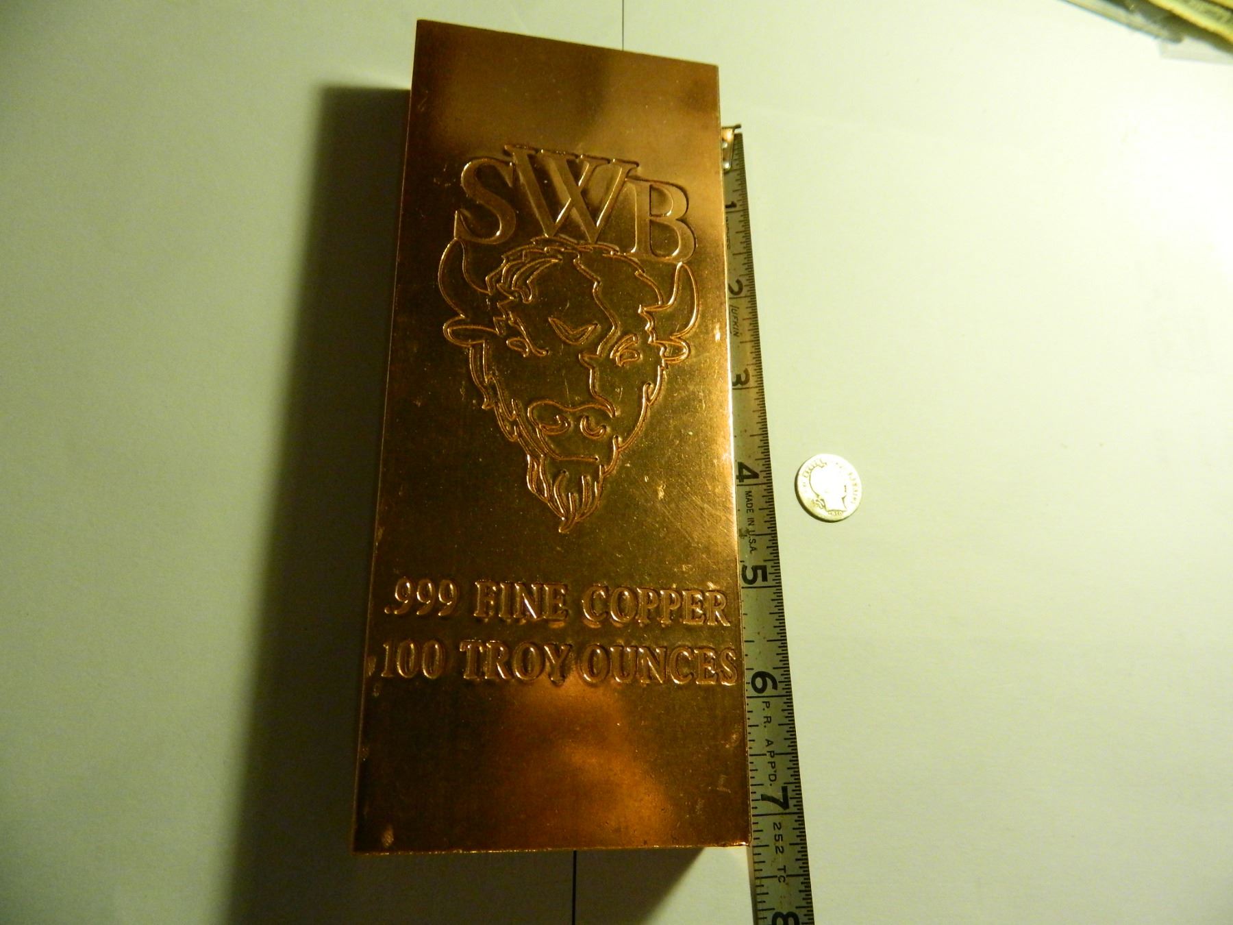 One Hundred Ounce .999 Fine Copper Bullion Bar, 100 Troy Ounce, SWB Buffalo Logo, $15 Shipping.