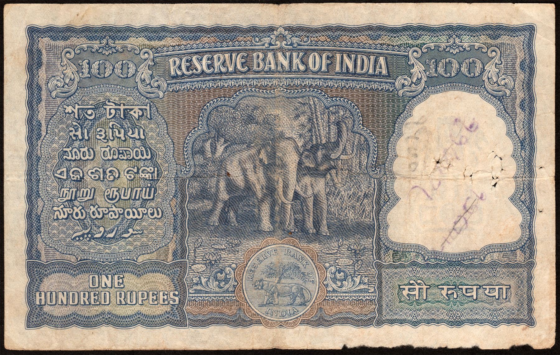 Republic India, 1951, 100 Rupees, 2nd Issue, Bombay Circle, Signed by B. Rama Rau, A Prefix, S. No. A7 564091, a picture of elephants on the reverse, (RM & AM # R7.1), pin holes, folds, stains, tears, about very fine.