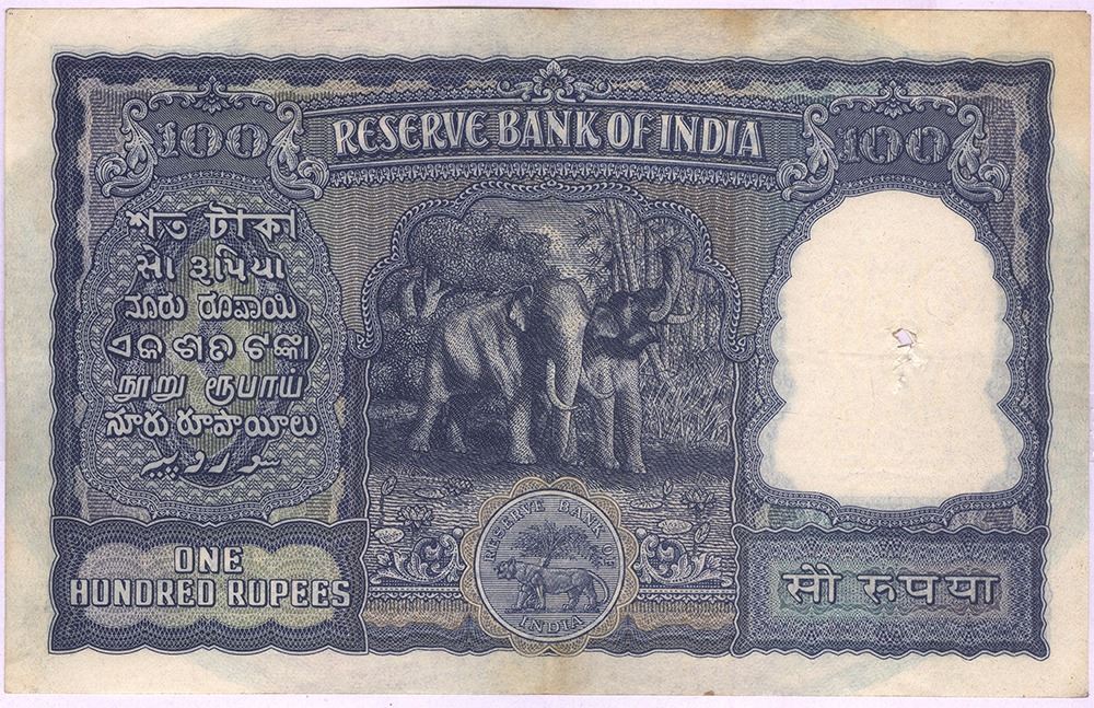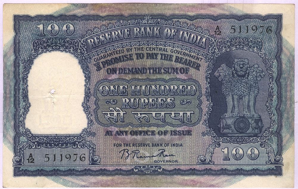 1950,100 Rupees, B. Rama Rao, FirstIssue,Madras,Q Prefix,S.No. Q11 006237,(KJ DR, JG ND # G1C), folded, holes, about very fine,Rare.