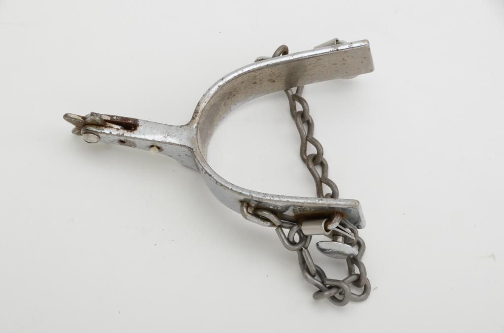 One Kelly-marked nickeled spur with small star rowel and attached chain. Est.: $50-$75.