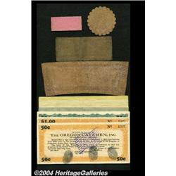 One Leather Issuer and Four Paper Issuers.Albany, OR- A. Sternberg Saddlery Leather Flower 10ó, Leather Small Rectangle 25ó, Leather Large Rectangle $1 Mar. 23, 1933 Shafer OR75-.10b, OR75-.25a1, OR75-1a1 CU, VG, CUAlbany, OR- Albany Scrip Association 25ó, 50ó, $1, $5 Shafer OR61-.25, OR61-.50, OR61-1, OR61-5 VF or BetterAstoria, OR- Astorian Evening Budget $1 1933 Shafer OR85-1 XFGrant's Pass, OR- Oregon Caveman, Inc. 1933 25ó, 50ó, $1 Shafer OR150-.25b, OR150-.50b, OR-150-1b AU or Better, cancelledOregon National Guard- Astoria Chamber of Commerce 10ó June 28, 1933 Shafer OR90.10d CUThe leather issues are scarce and interesting and they also have punched double-digit serial numbers, while the Oregon Caveman issues have been validated with thumb prints. 12 notes <BR><BR><B>Important notice:</B> Heritage usually auctions material at the rate of 200-250 lots per hour. On some occasions eBay Live bid software or the Internet may not be able to keep up with the pace of the auction. We recommend placing a realistic absentee bid now as insurance to avoid disappointment. Occasionally the auctioneer may eliminate or reject an eBay Live bid, and the auctioneer may also reopen a lot after the close of the eBay live bidding (usually because we missed an audience bid), and may reject your bid even if it shows you as the winning bidder. By bidding via eBay Live, you agree that Heritage may award the lot to another bidder at its sole discretion under the circumstances described above or any other reasonable circumstances. Since eBay bids are not shown to us until we open the lot on the floor, we treat those bids just like floor bids. In most cases the floor responds before the eBay bid is presented to us, due to Internet lag time, so for consistency we have made it a policy that floor bids are always considered first over tie eBay live bids. Also please note that all Heritage lots purchased through eBay Live carry a 20% Buyer's Premium. Please make sure you read the Terms and Conditions before you bid. <BR><BR><B>IMPORTANT ANNOUNCEMENT ABOUT RESERVES:</B> Heritage now divulges all reserves on its web site 7 days before every auction. If you want to know whether the reserve on this lot has been met, and if not, what the reserve amount is, please visit this lot page on the HeritageCoin.com web site, or email: bid@HeritageGalleries.com