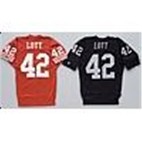 On the left front tail of 49ers jersey is the "Wilson Prestige Teams" manufacturer's wash tag with the jersey size "46" attached. On the front, back and on each sleeve of the jersey is the player number "42". Across the back of the jersey is "LOTT" on a red name plate. All lettering and numbering is done in white tackle twill. On the left front tail of Raiders jersey is the "Wilson Prestige Teams" manufacturer's wash tag with the jersey size "46" attached. On the front, back and on each sleeve of the jersey is the player number "42". Across the back of the jersey is "LOTT" on a black name plate. All lettering and numbering is done in silver tackle twill. On the front at the neck is the official "NFL" embroidered logo. Both jerseys show game-use and appear to have no alterations of any kind.