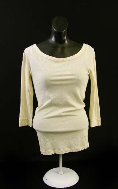 One Missed Call - Beth's (Shannyn Sossamon) off-white "J.Crew" wide neck, 3/4 sleeve shirt (* threads coming undone around base) (size S). Faded gray-ish purple "Club Monaco" pants (* pants were labeled "faded, use as last resort") (size 6). (screen worn)
