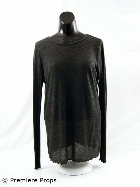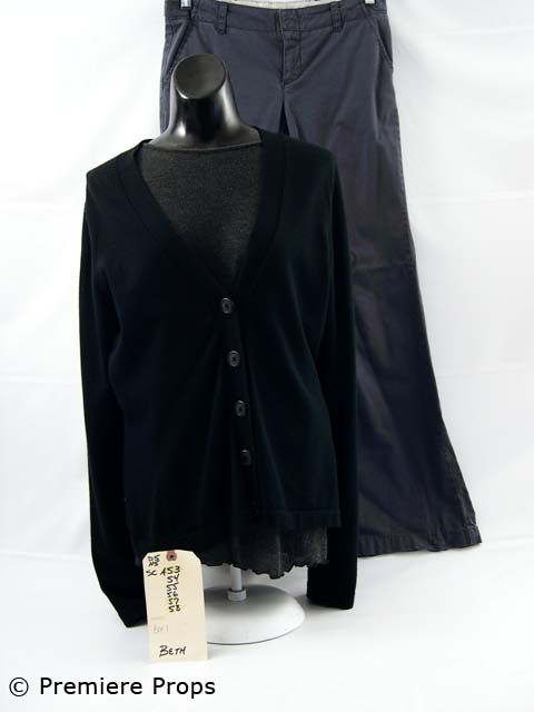 One Missed Call - Beth's (Shannyn Sossamon) charcoal "Juicy" L/S knit shirt. Black "Banana Republic" L/S 5 button cardigan sweater (size L). Gray-ish purple "Club Monaco" pants (size 6). Includes wardrobe tag / screen worn