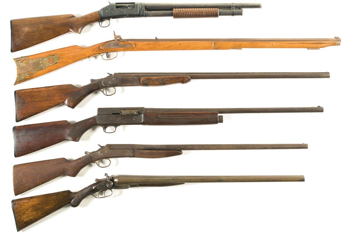 E) Left side of barrel breech marked "16 Gauge" with no other visible markings. Forearm is very loose from frame and barrel, buttstock is very loose and has two major cracks, and buttplate has been removed.