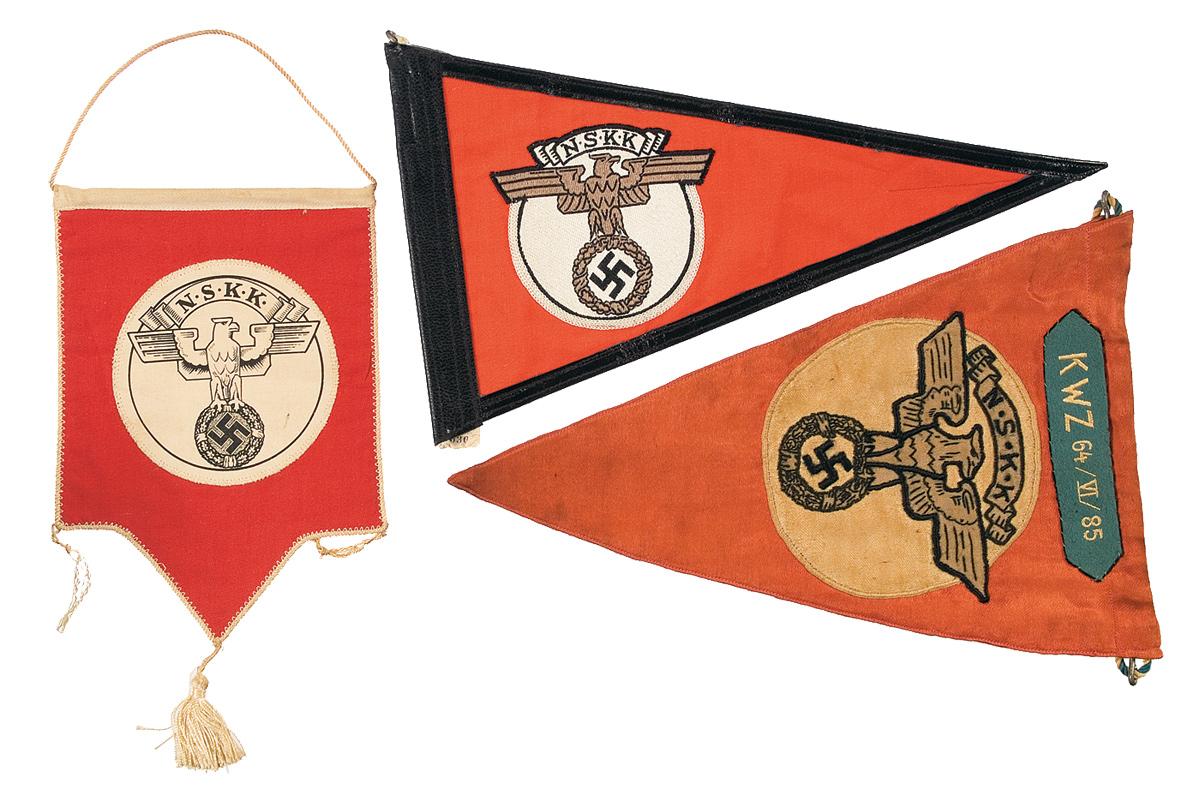 Formed in 1930 as the transport force for the Nazi Party, the Nationalsozialistiches Kraftfahr-korps (National Socialist Motor Corps) grew to become the chief military and civilian driver's education organization in the Third Reich. 1) NSKK desk pennant, 11 3/4" long, red field with white circle, NSKK eagle and blue banner marked "KWZ 64/ VI/ 85". With hanging cord. 2) Desk banner, 7 3/4" long, red field, white trim and circle, printed logo, and white tassels. With cord. 3) Car pennant, 12" long, red with black leather trim, white circle, and brown and black stitching. With hook, cord, and RZM label. See included images. Items 1 and 2 are pictured on pg. 205-206 of "NSKK, NSFK Uniforms, Organization & History" by J. Angolia & D. Littlejohn (1994).