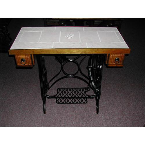 We are pleased to offer this Unique and One Of A Kind Ceramic Tiled Table/Stand built on top of an antique Circa 1870's "Arlington" Peddle style Sewing Machine Base. We had this made to salvage the base which is very well made from hard steel and it comes with the two original Oak Drawers and attached hardware. The sewing peddle and wheel still do operate which makes for a very interesting conversation piece. The top is bolted to the base and has a very nice light colored tile arrangement. Would make a great plant table and a wonderful investment has well. For additional photo's or information on this piece please contact us by clicking on the "EMAIL DEALER" button, we'll be happy to supply you with any information on this piece that is requested including a shipping quote if needed. Thank you for looking.