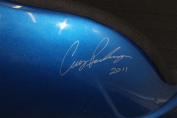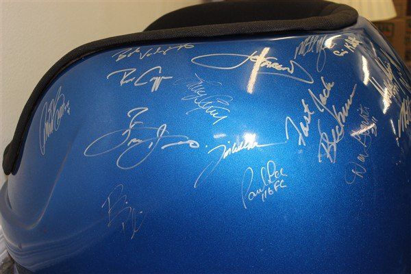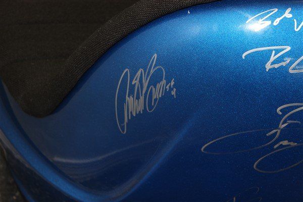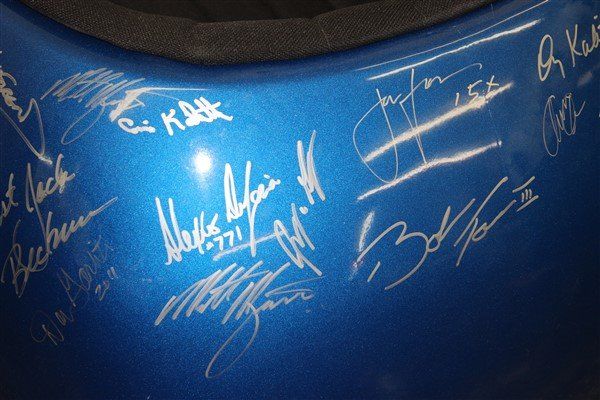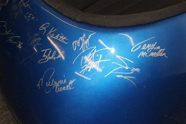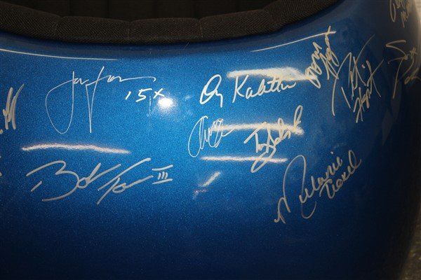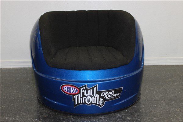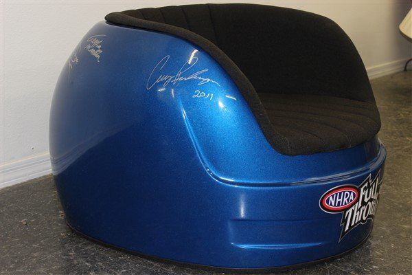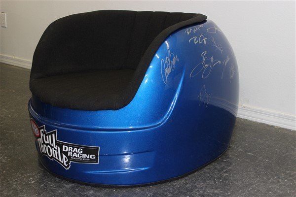 This one of a kind Helmet chair has multiple signatures including John Force and other racers, NHRA Emblem Racing Series, It was custom made for a charity in 2011, approx 25" tall x 33" wide x 38" deep