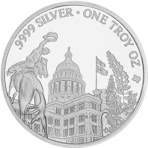 Contains 1 Troy oz of .9999 pure silver in BU condition. Obverse features the Lone Star and the outline of Texas. Reverse bears iconic imagery of the Lone Star State along with the purity, metal content, and weight of the round.