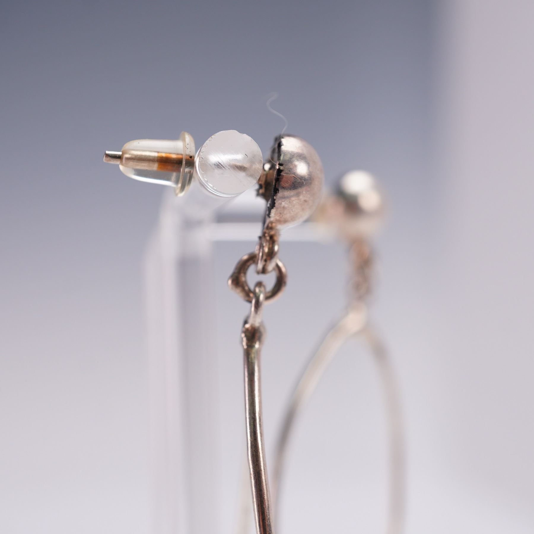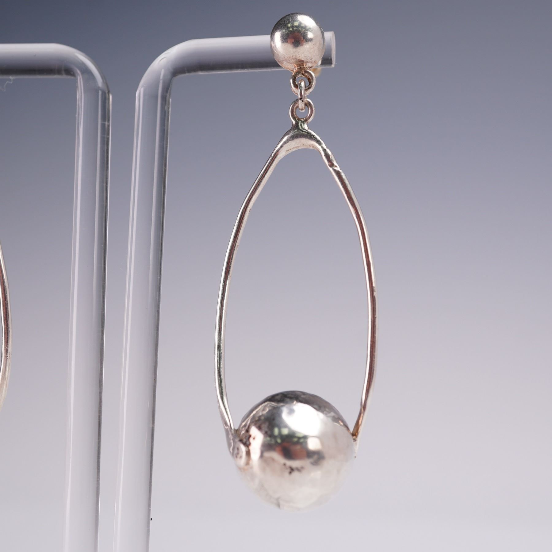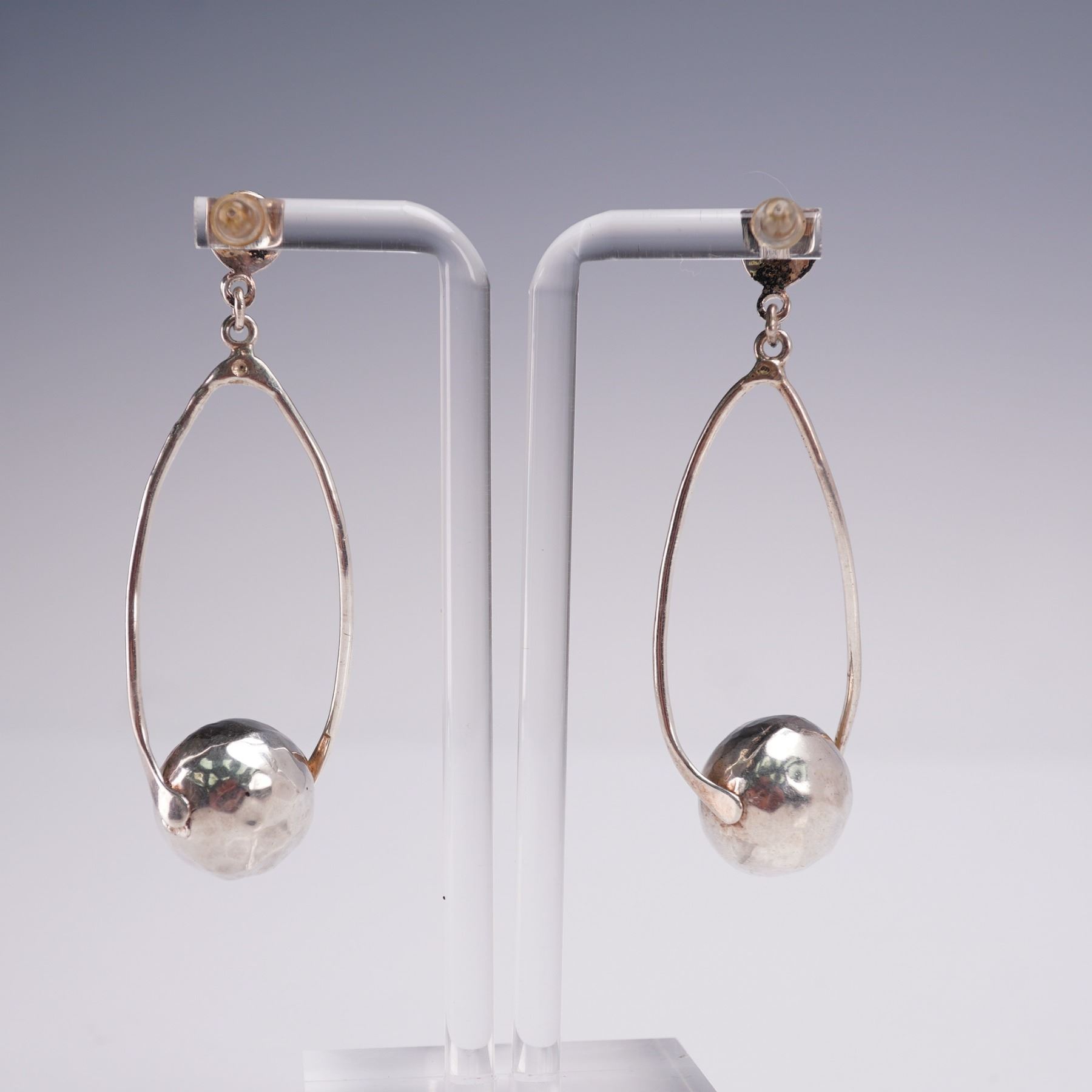 Pair of modernist sterling silver drop earrings featuring an open teardrop hoop with a suspended hammered ball accent and post-back closures. Each earring measures approx. 2.5"H. Total weight over 12 grams.