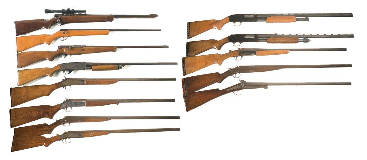 L) Produced from 1909-56, 2 1/2" chamber, choked improved modified, pull 14 3/4", very faint markings, sanded/crudely repaired stock with poorly added vented WFS recoil pad.