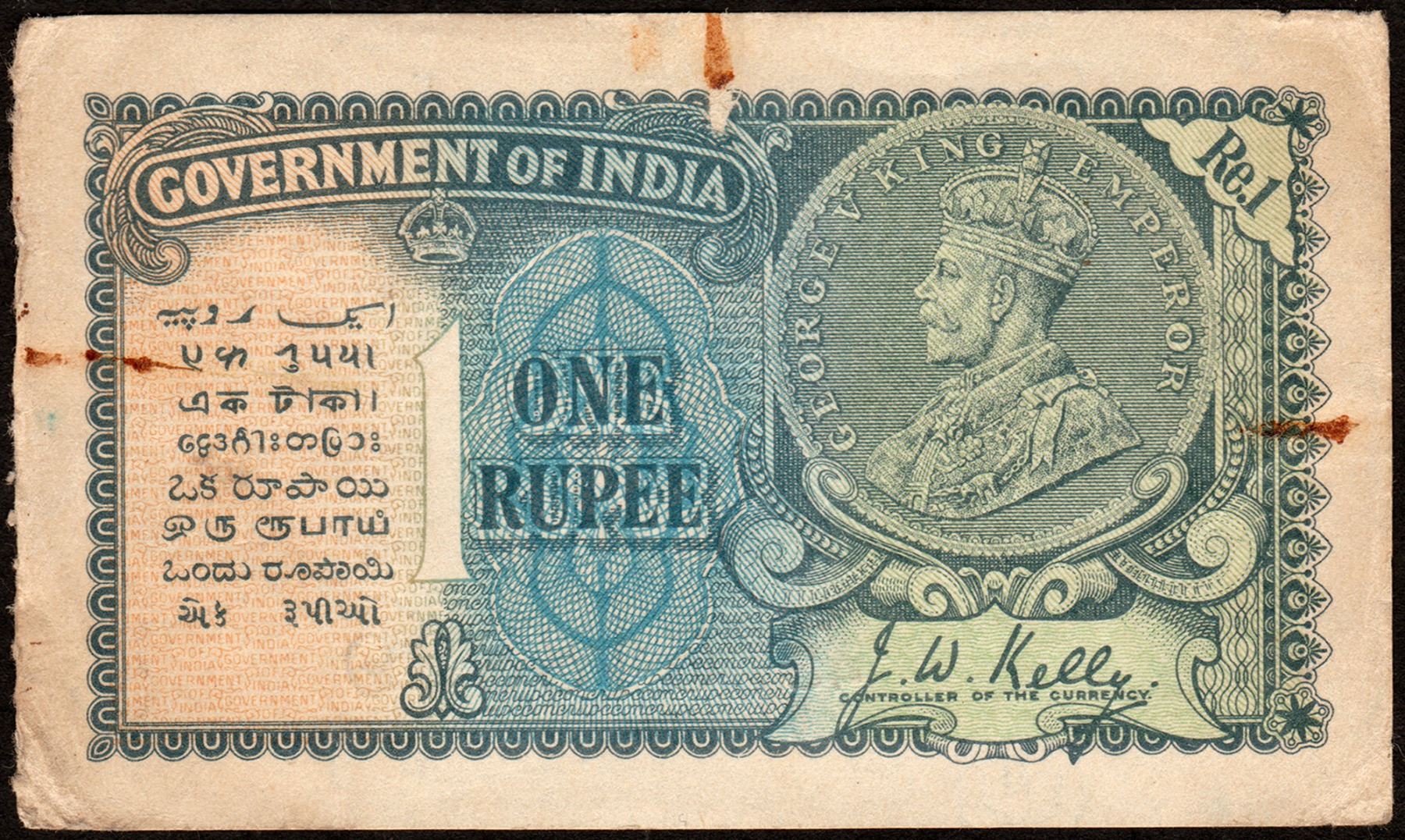 British India, 1935, King George V, 1 Rupee, Signed by J.W. Kelly, F Prefix, F43 648829, Watermark Variety A, Printed at Nasik, (KJ & RR # 3.2.1A), folds, rust, about extremely fine, Rare.