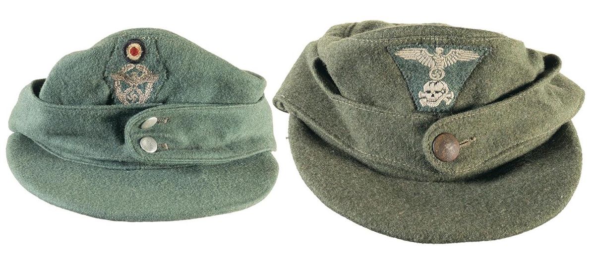 1) Nazi police field cap, green felt construction with an embroidered cockade/police eagle patch, 2 alloy buttons on the earflaps, and a green silk inner lining. No makers marks are visible. 2) SS field cap, "feldgrau" felt construction with embroidered SS eagle/totenkopf patch on the front, a single large darkened brass button for the earflaps, and a brown cloth inner lining stamped "SS-BW/58"