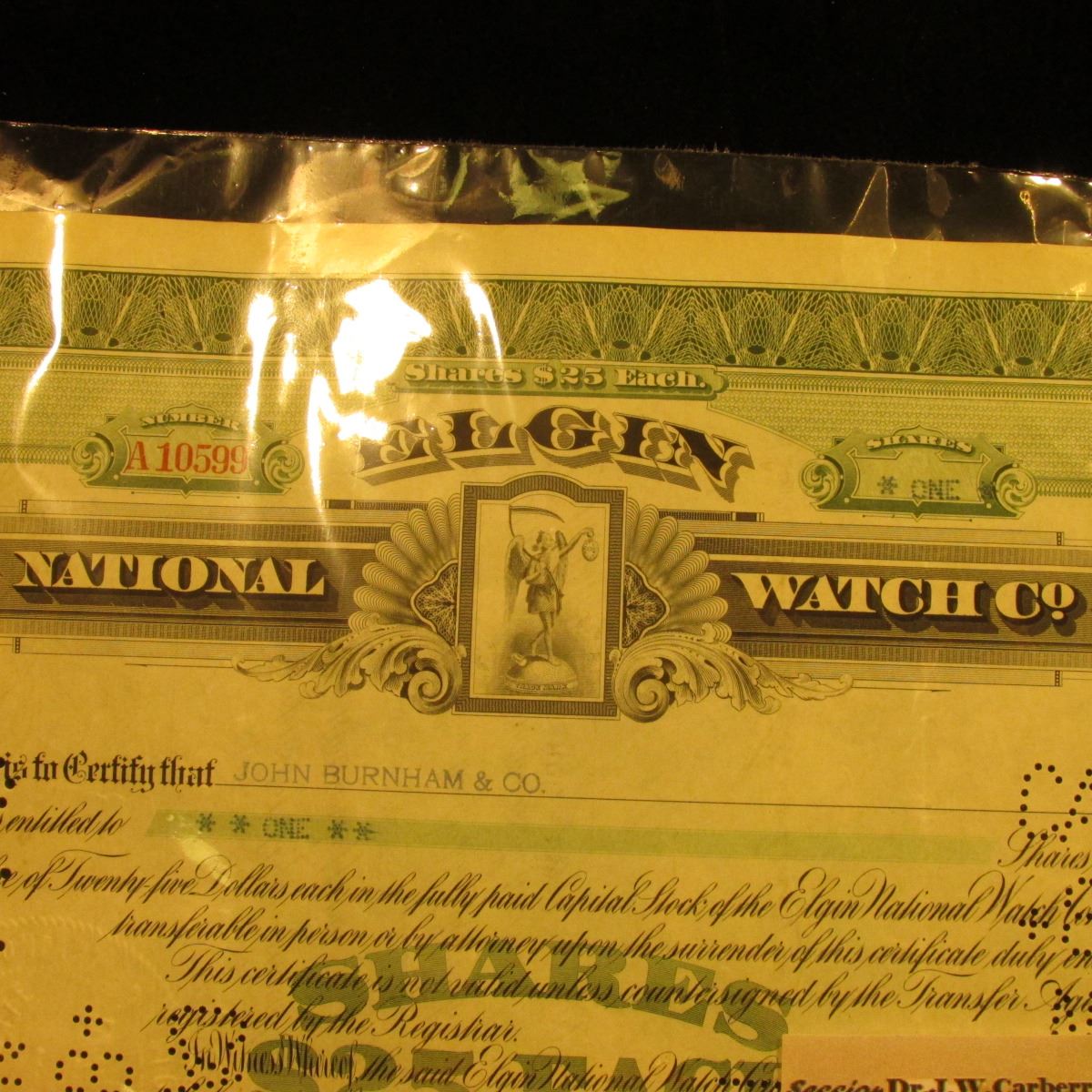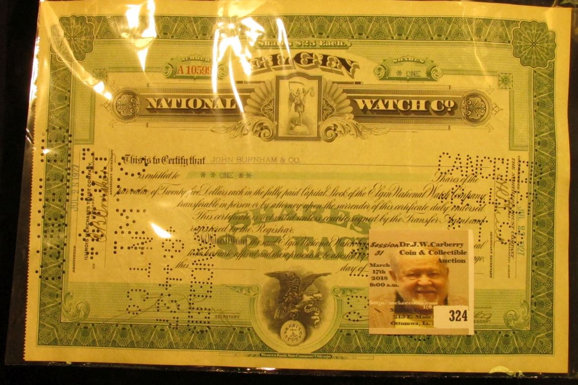 One Share Stock Certificate dated July 27, 1927 from "Elgin National Watch Company". Hole cancelled