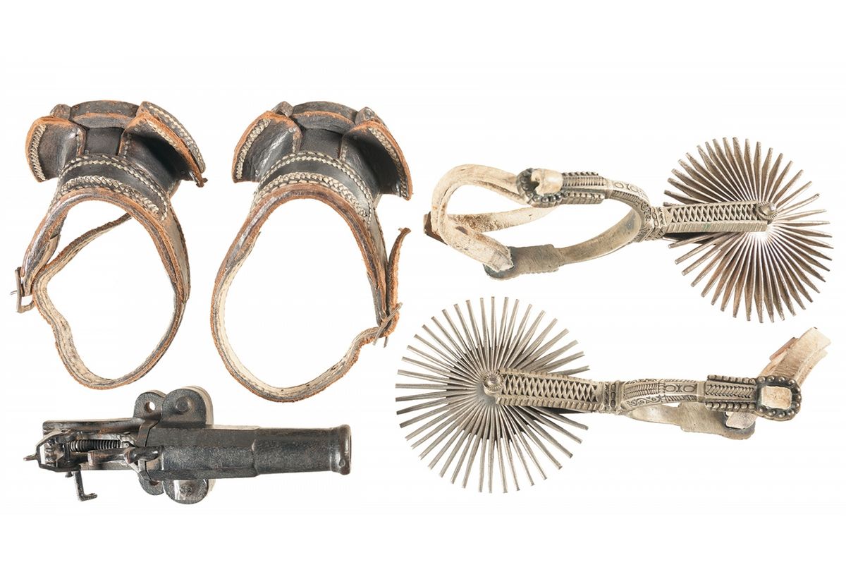 1) "DEFORD" marked 12 gauge alarm/signal cannon, pinfire system with an exposed hammer and trigger hook with multiple tripline mounting points. 2) Parade spurs, German silver with engraved decoration, rawhide straps and 4 3/4" rowels. 3) Rodeo spurs, tacked and stitched leather construction. Lot is fair overall.