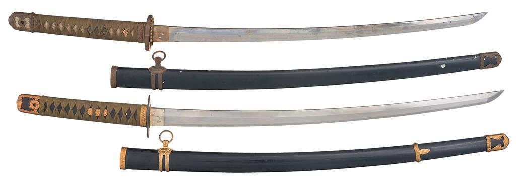 1) Signed shin-gunto pattern sword, 35 1/4 inches overall with a 24 inch long blade, showing a fine wavy hamon and a silver finished habaki. Gold washed tsuba with cherry blossom decoration and 3 spacers on each side. Green-colored cord wrap over white rayskin on the grip, with gilt copper fittings, a spring-loaded retainer in the fuchi, and cherry blossom menuki. The left side of the tang bears an engraved 6-symbol signature with 3 painted symbols. With a black enamel finished alloy saya. 2) Japanese-style sword, 34 1/2 inches long overall with a 24 1/2 inch blade, a straight hamon and a silver-finished copper habaki. Round iron tsuba with one spacer, green cord wrap over a black treated canvas base, and stamped shin-gunto style fittings. With a black lacquer finished saya.
