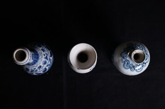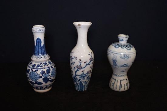 (Edge Repaired and Small Cracks), One Small Blue-and-White "Figures" Vase(Meiping) and One Small Blue-and-White "Floral" Vase with a Slender Neck. Condition as is, shown in photos. H: 19.5cm,Width(max): 7cm?H: 16cm,Width(max): 8cm?H: 19cm,Width(max): 8.5cm