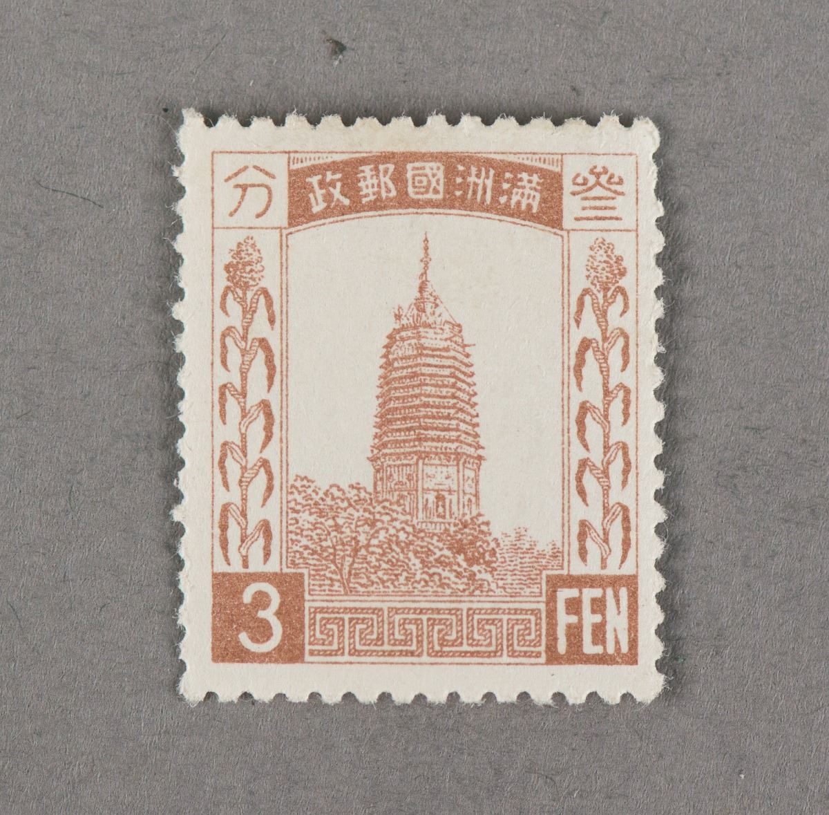 One "3 cents" Chinese stamps, Man Ord.4 3rd Print Ordinary Issue, 1934.11.1; 18.5 mm x 22.5 mm; Provenance: private Canadian collector