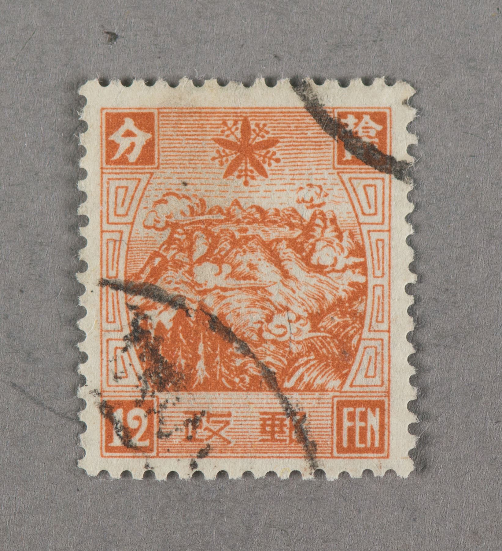 One "12 cents" Chinese Stamp, Man Mail.3 3rd Print China Mail Issue, with postmark, 1936.1 - 1936.4; 18.5 mm x 22 mm; Provenance: private Canadian collector