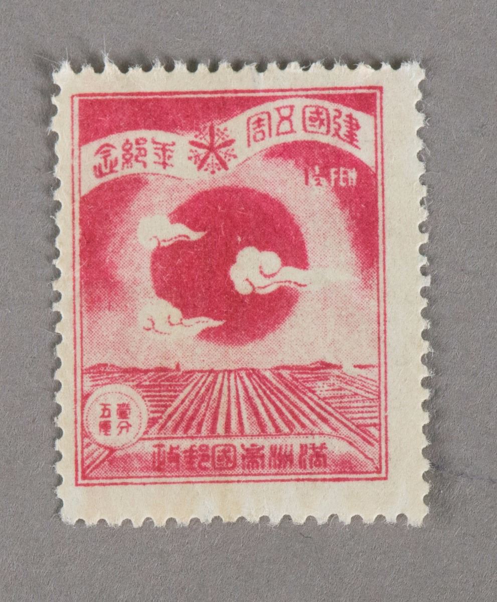 One "1.5 Cents" Chinese stamp, Man C.5 5th Anniv. of th Puppet Manchukuo Commemorative Issue (1937.3.1); 21.5 mm × 27 mm