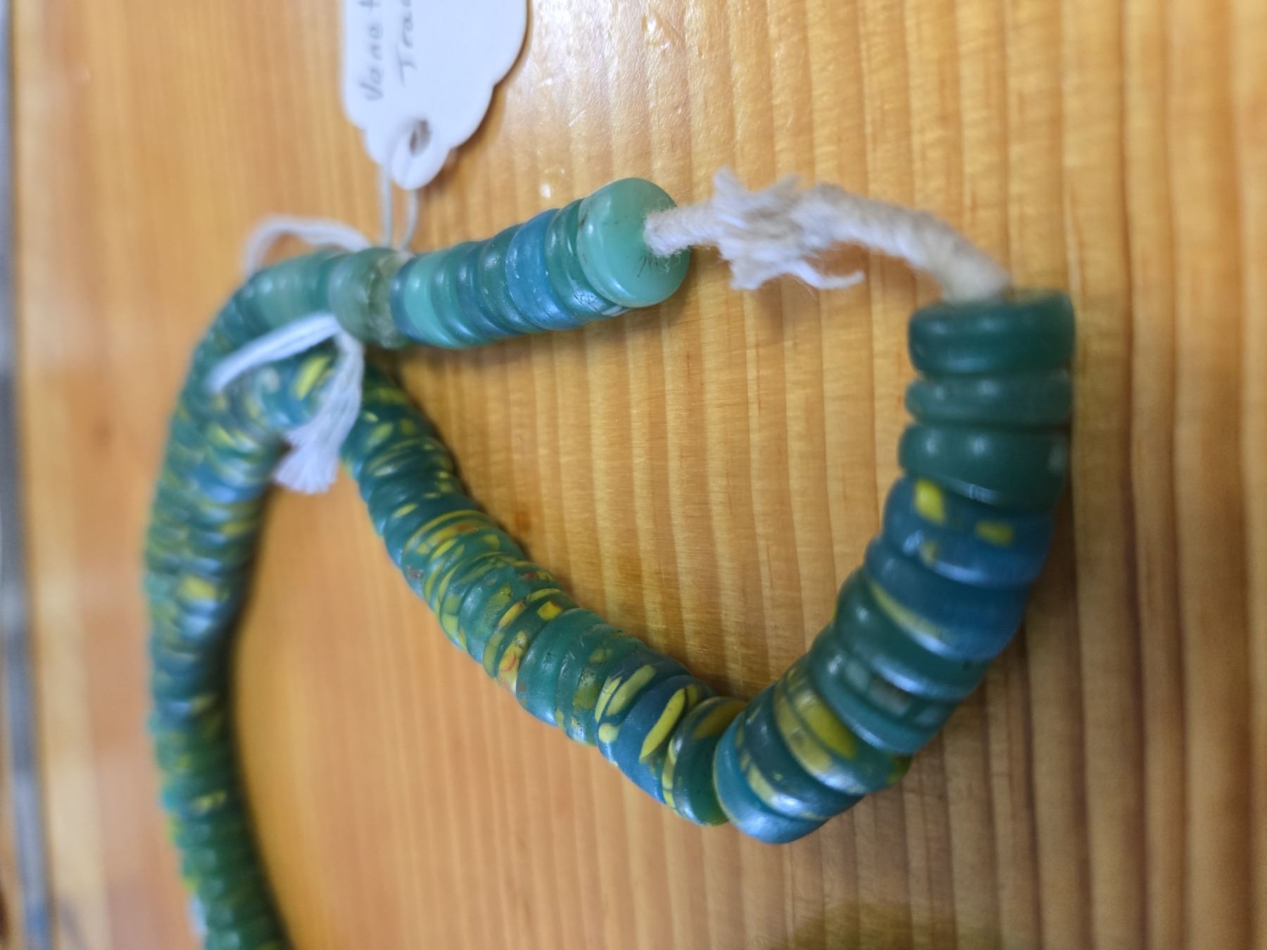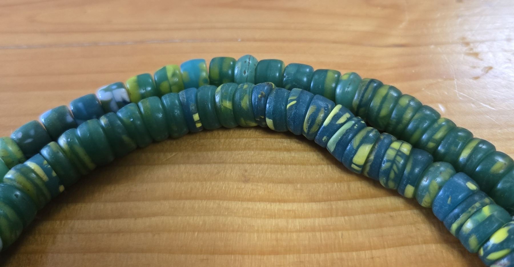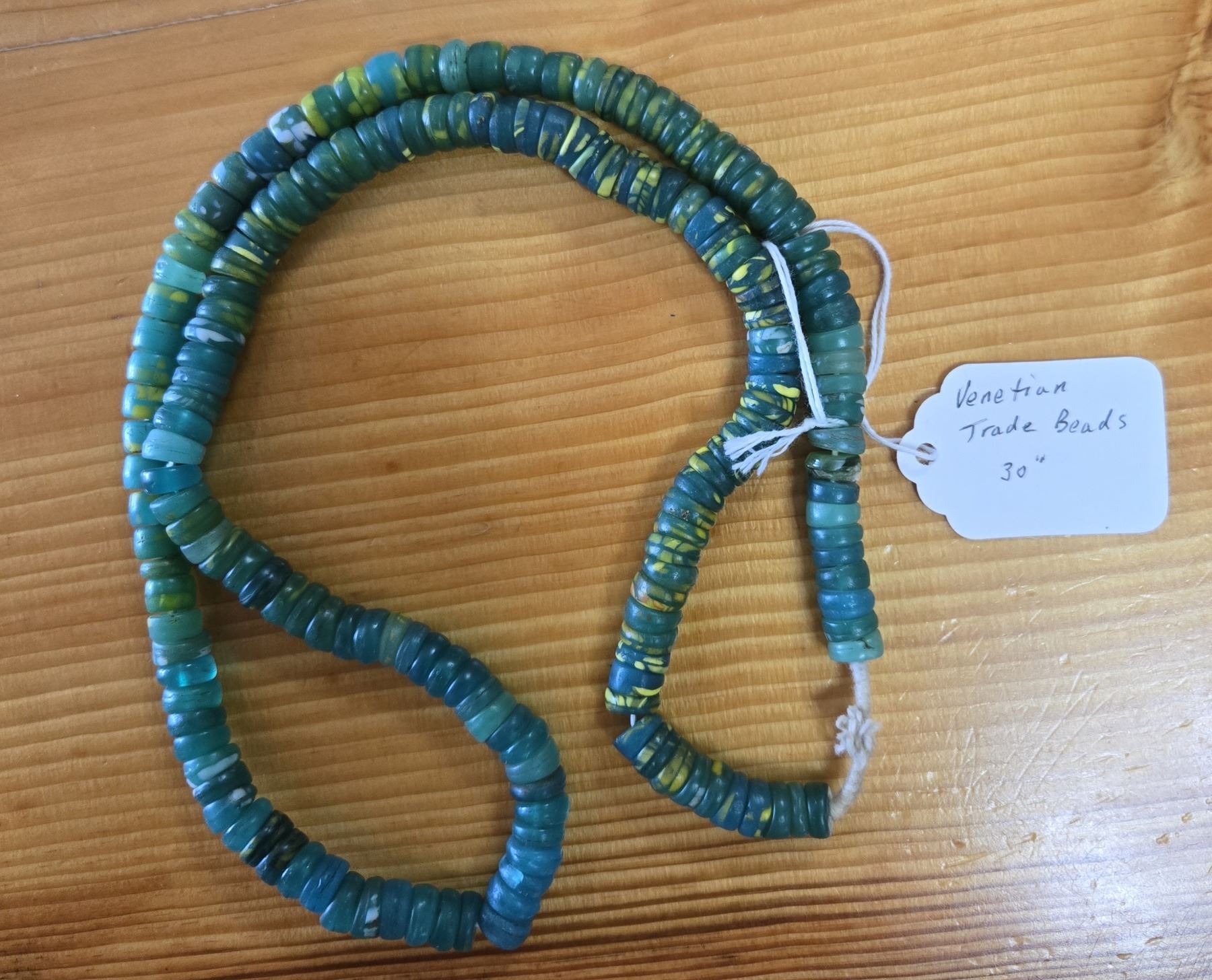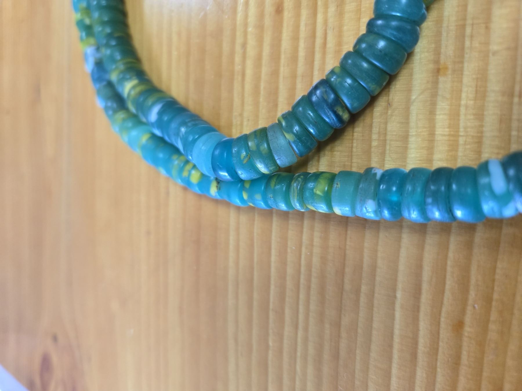 One Thirty Inch Strand of Green Antique Kambora Trade Beads. Made in Venice. Each bead measures approximately 8 mm in diameter and some have white and yellow specks.