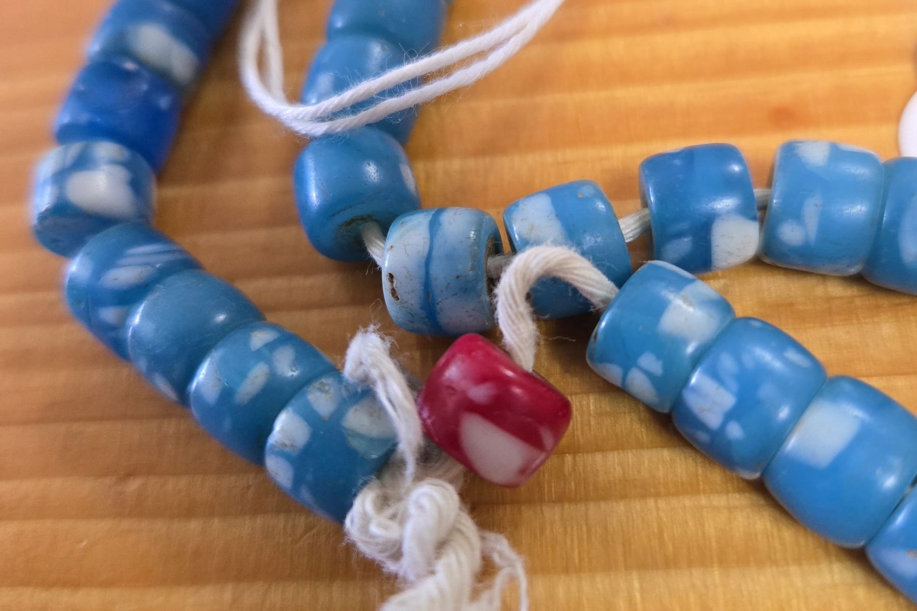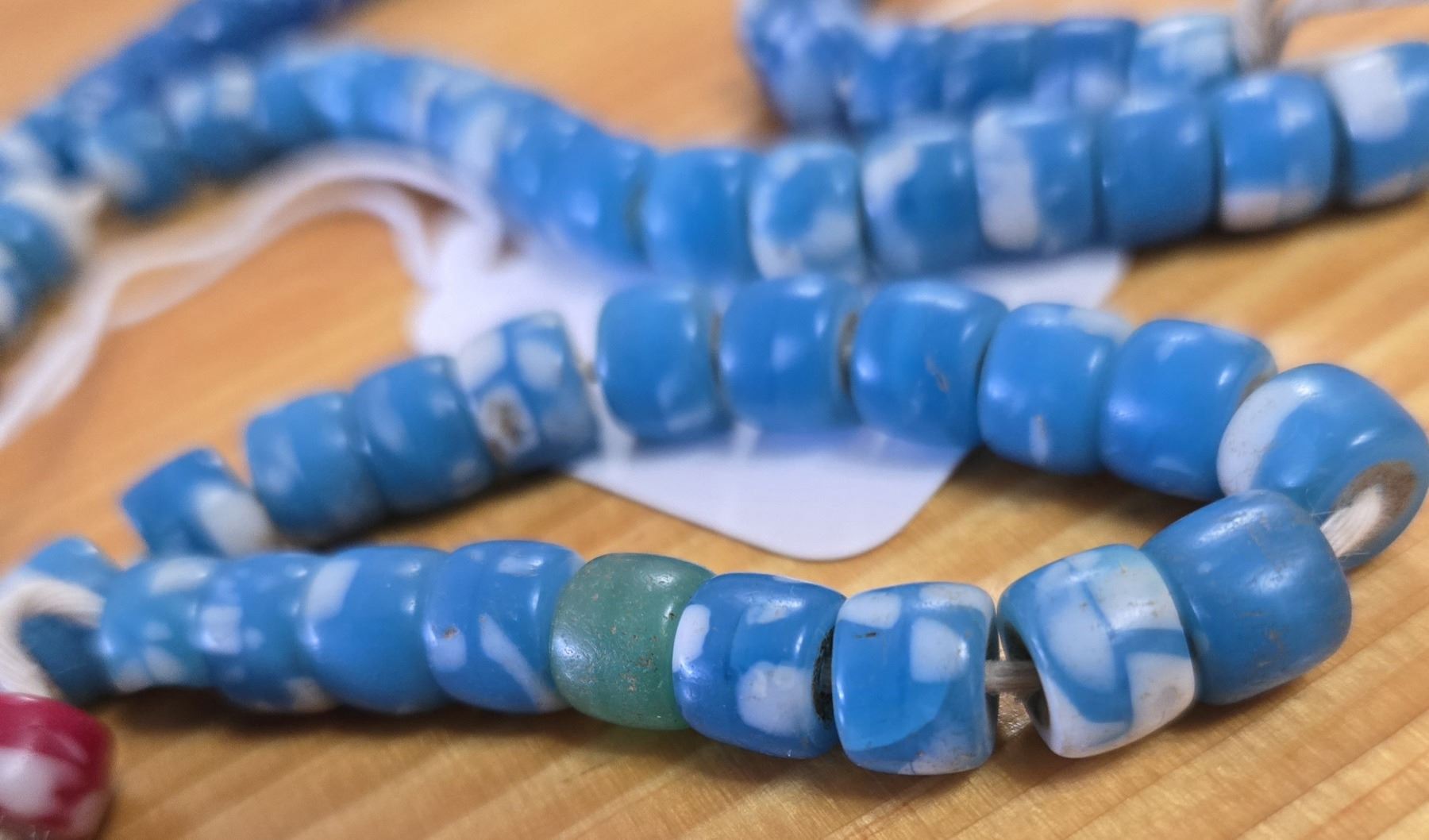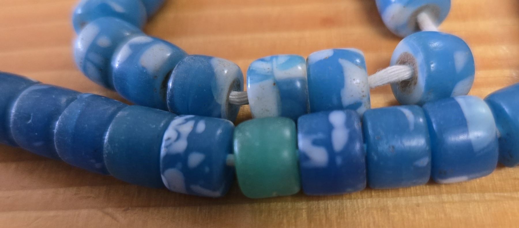 One Twenty-Six Inch Strand of Antique Blue Kambora Trade Beads. Some beads have flecks of white and green and beads measure approximately 9 mm in diameter.