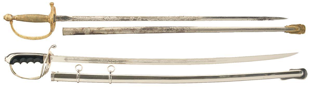 1) U.S. Henderson Ames Model 1840 N.C.O. sword, 28" etched blade, gilt brass hilt and nickel sheath with engraved fittings. 2) U.S. N.S. Meyer Model 1902 Officer's Sword, 30" single fuller etched blade with "C.R.FITCH" in a panel, nickel 3-branch guard, ribbed grip and nickel finished sheath. Both are very good or better.