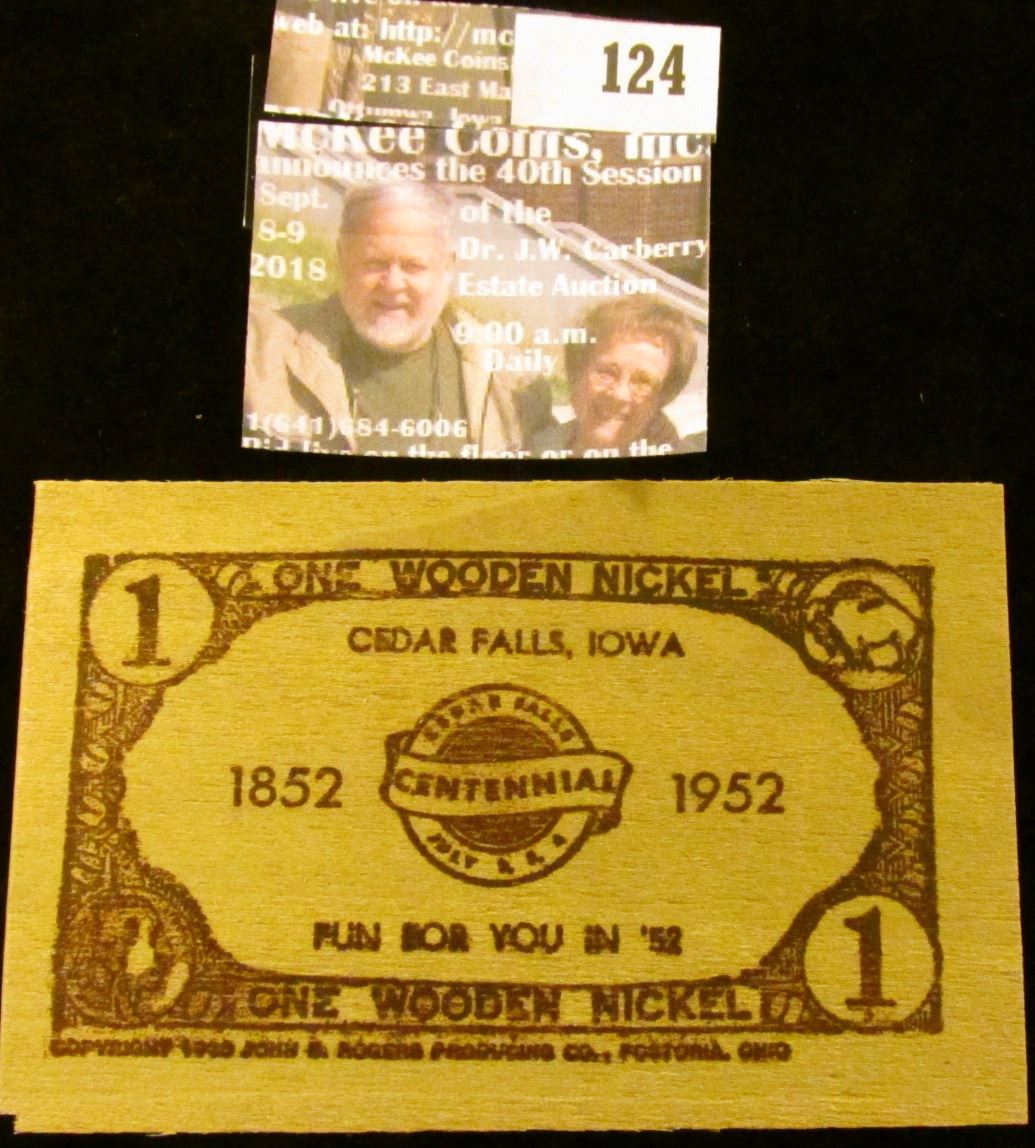 "One Wooden Nickel/Cedar Falls, Iowa/1852 Centennial 1952/Fun For You in '52…", rectangular.