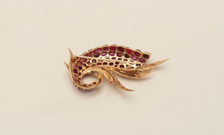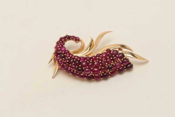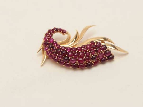 One antique peacock tail brooch in 14k yellow gold set with approx 5ct of cabochon rubies(17gms). EST.$2,000-2,500