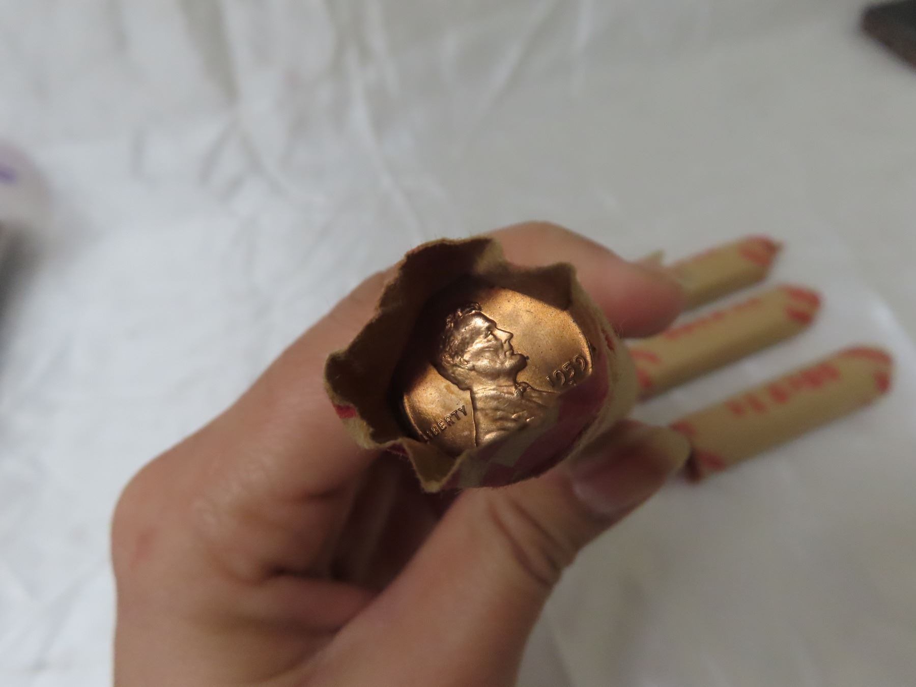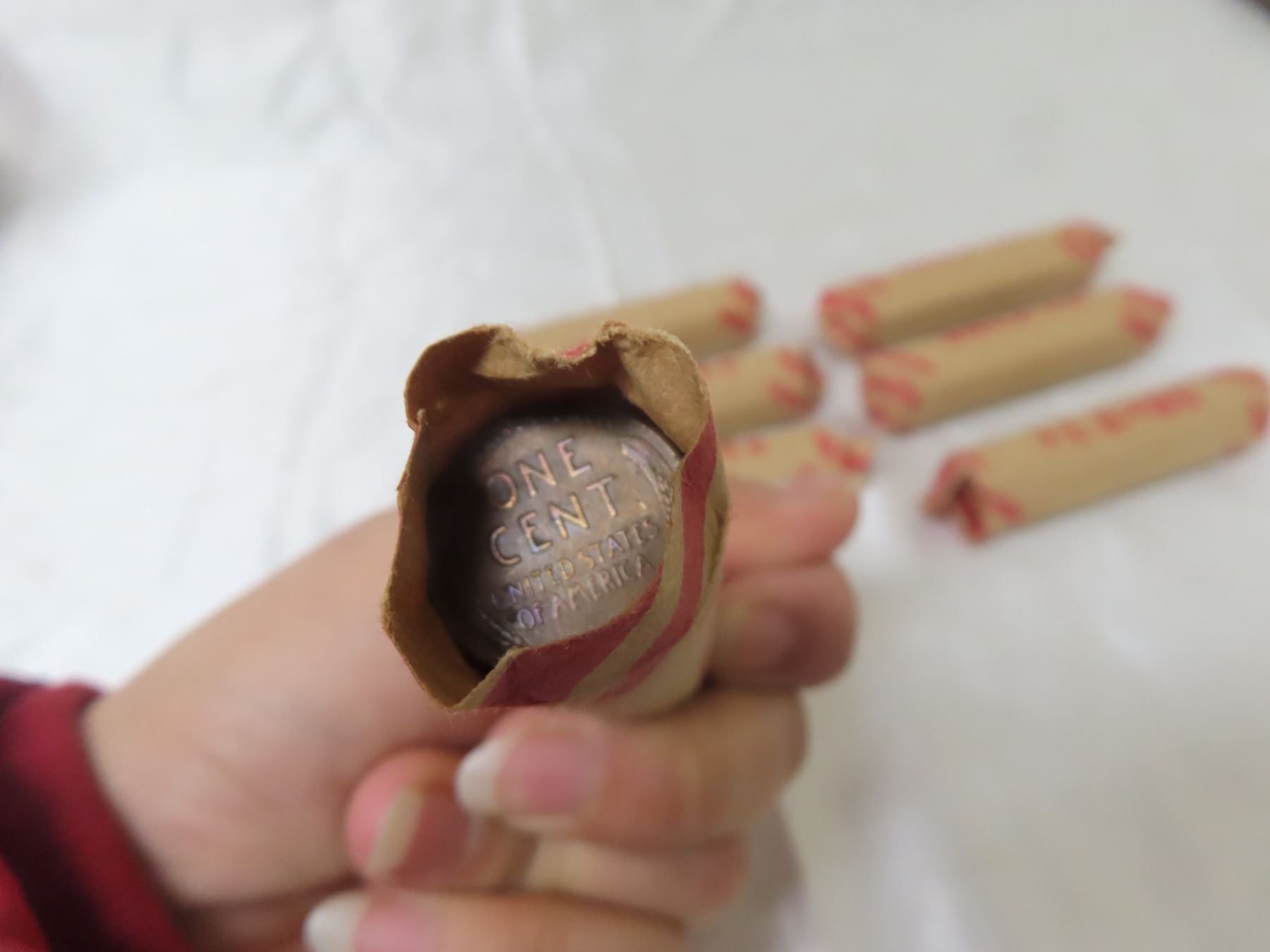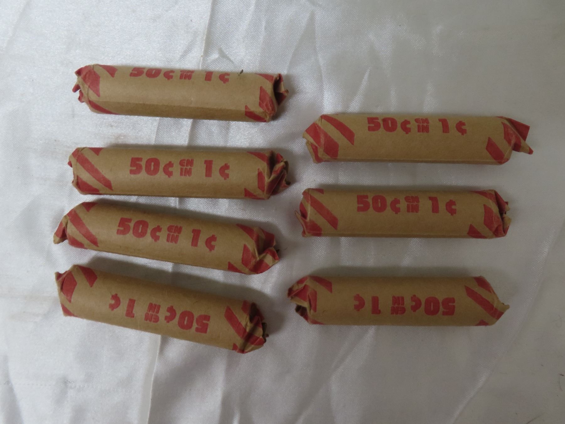 One bag of 7 rolls of U.S. Lincoln Cents. Some are circulated, others are BU Red.