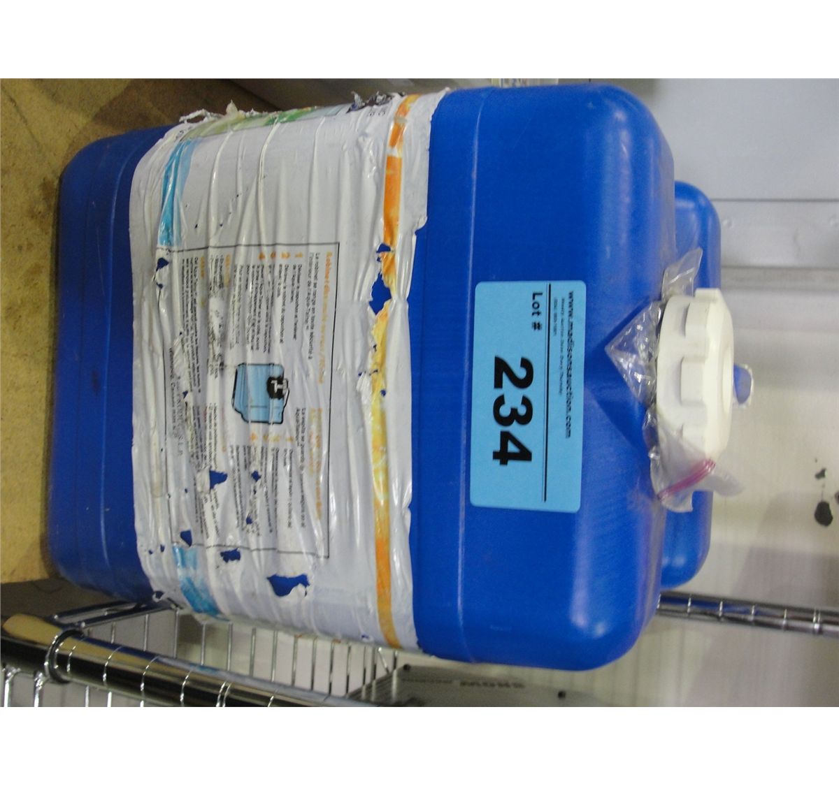 One blue container of snow machine fluid