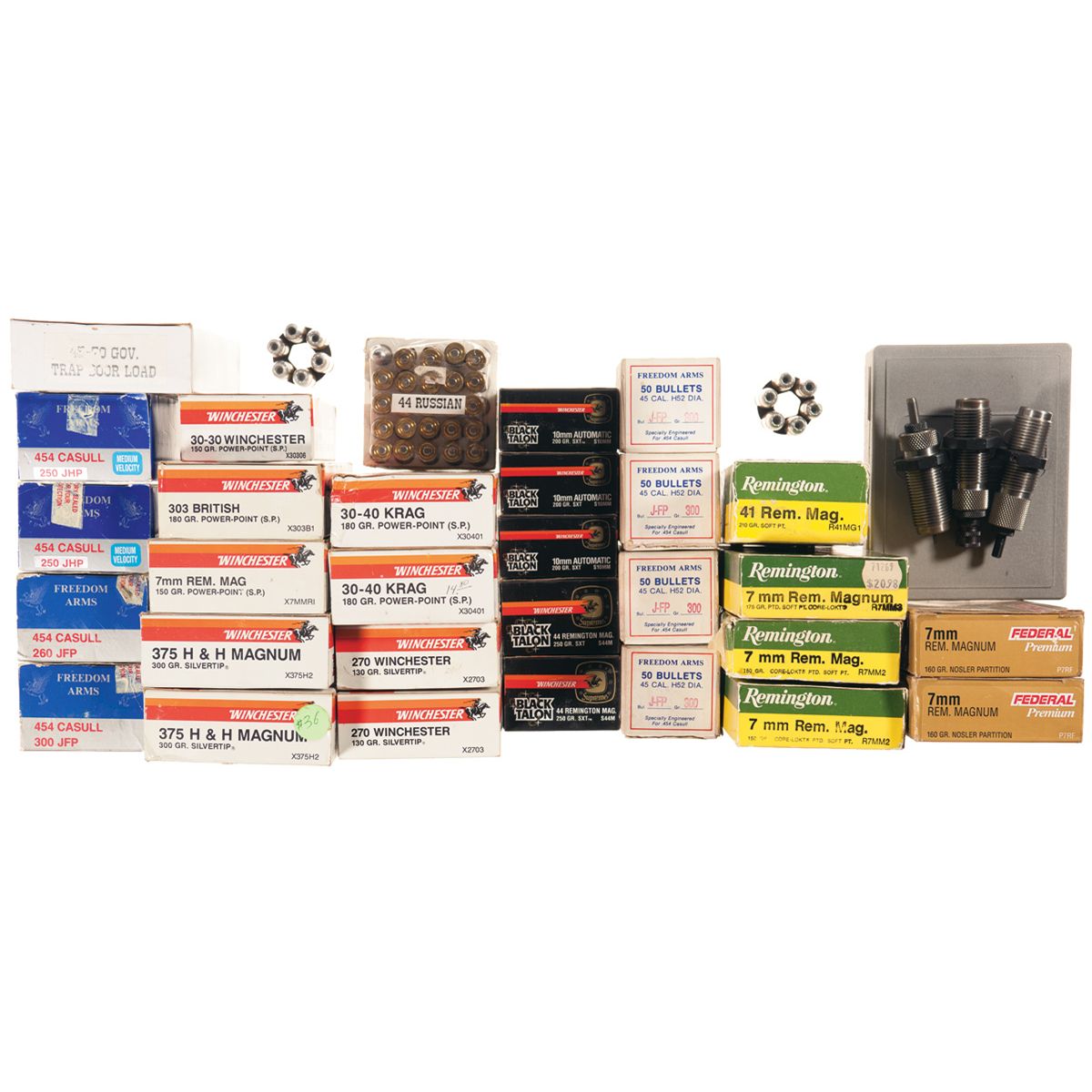 RCBS carbide 3 die set for .454 Casull, 1 box of 20 commercially reloaded 45-70, 1 package of 25 commercially reloaded .44 Russian, 1 box of 20 Winchester 30-30, 1 box of 20 Winchester .303 British, 1 box of 50 Remington .41 Remington magnum, 2 boxes of Winchester .270 Winchester containing 30 rounds total, 2 boxes of 20 Winchester 30-40 Krag, 2 boxes of 20 Winchester .375 H&H magnum, 4 boxes of Freedom Arms .454 Casull containing 190 rounds total, 4 boxes of Freedom Arms .45 caliber projectiles containing 185 projectiles, 3 boxes of 20 Winchester Black Talon 10mm auto, 2 boxes of 20 Winchester Black Talon .44 Remington magnum, 3 boxes of 20 Remington 7mm Remington magnum, 1 box of 13 Winchester 7mm Remington magnum and 2 boxes of 20 Federal 7mm Remington magnum. All counts are estimates and some ammunition may be corroded.