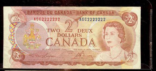 One digit "SOLID" numbered RADAR note "AGC2222222 BC-47a-i 1974 $2 VF. Extremely popular, solid 2's on a $2 note.