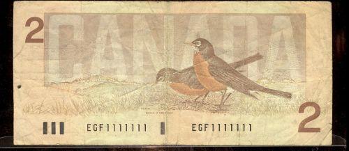 One digit "SOLID" numbered RADAR note EGF1111111 1986 $2 VG-F, an affordable solid numbered note.