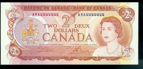 One digit "SOLID" numbered RADAR note "ARA4444444" $2 1974 BC-47b Gem uncirculated.