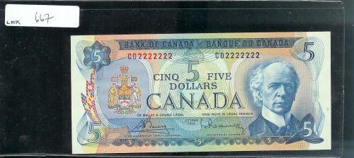 One digit "SOLID" numbered RADAR note "CD2222222" $5 1972 BC-48a Gem uncirculated.