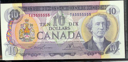 One digit "SOLID" numbered RADAR note "TA5555555" $10 1971 BC-49c Gem uncirculated.