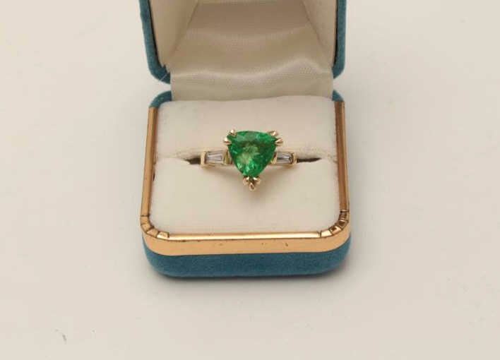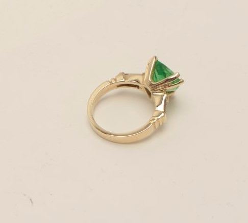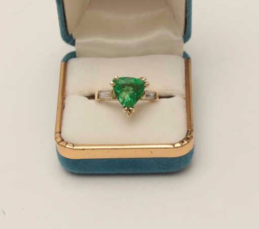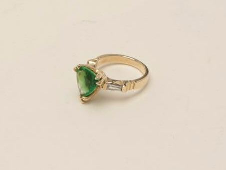One exceptional trilliant cut Green garnet ring set in 14k yellow gold with 2 baguette diamonds. EST.$3,000-4,000