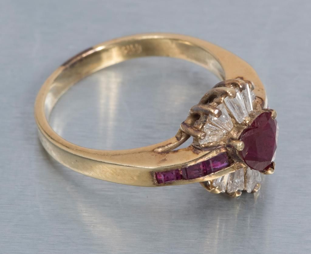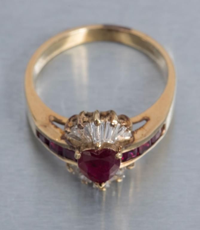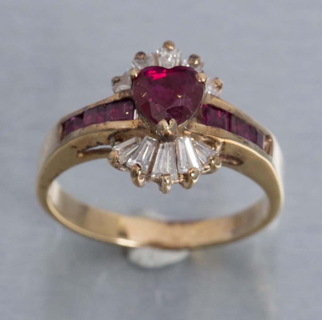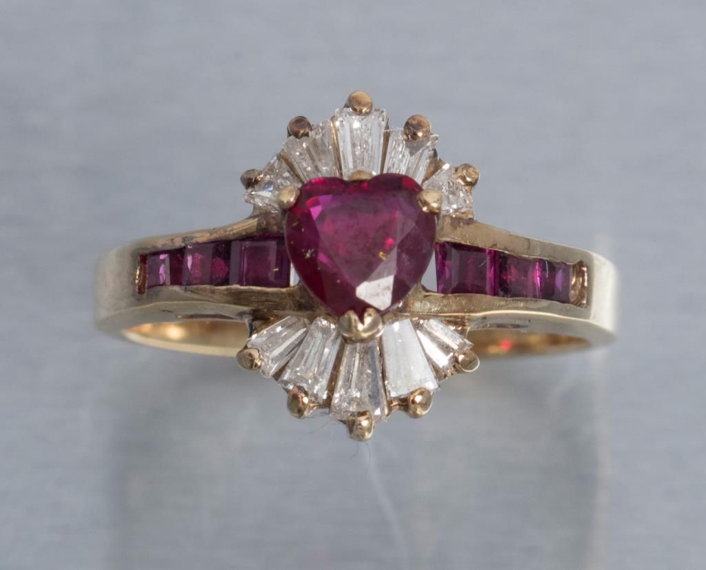 One fine heart shaped ruby set in ballerina style ring with tapered baguettes and square rubies. Est.: $500 - $600
